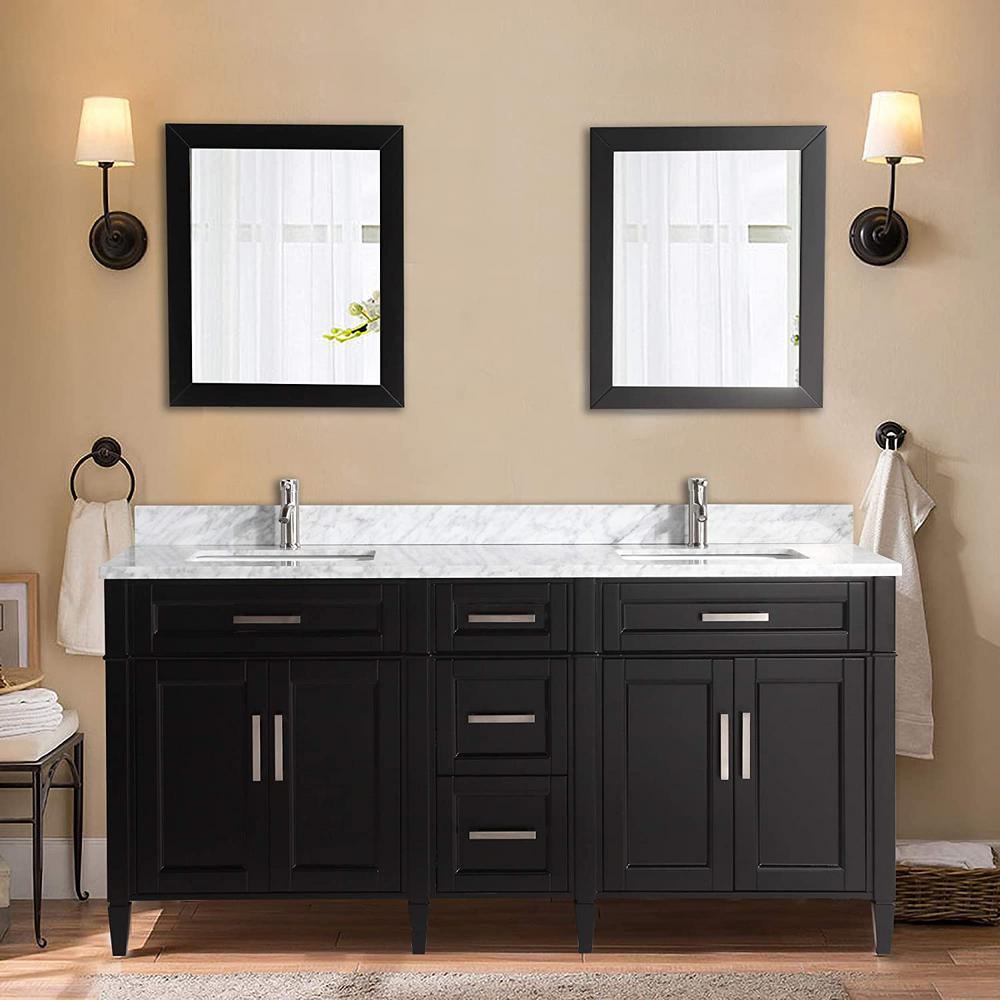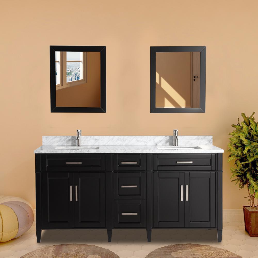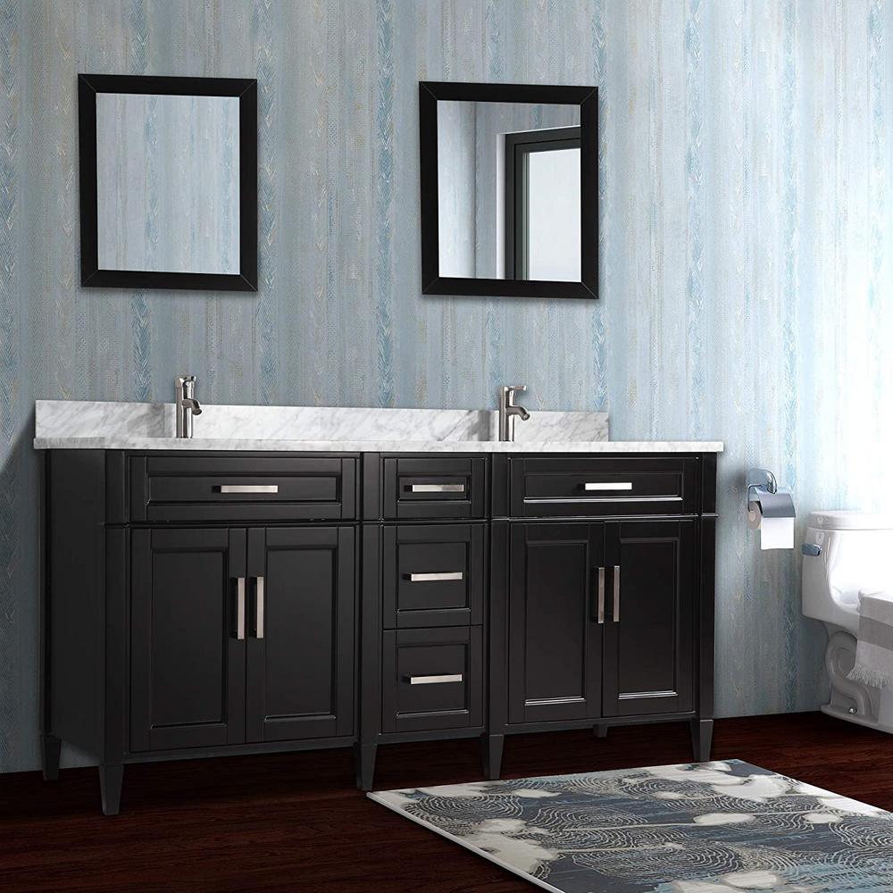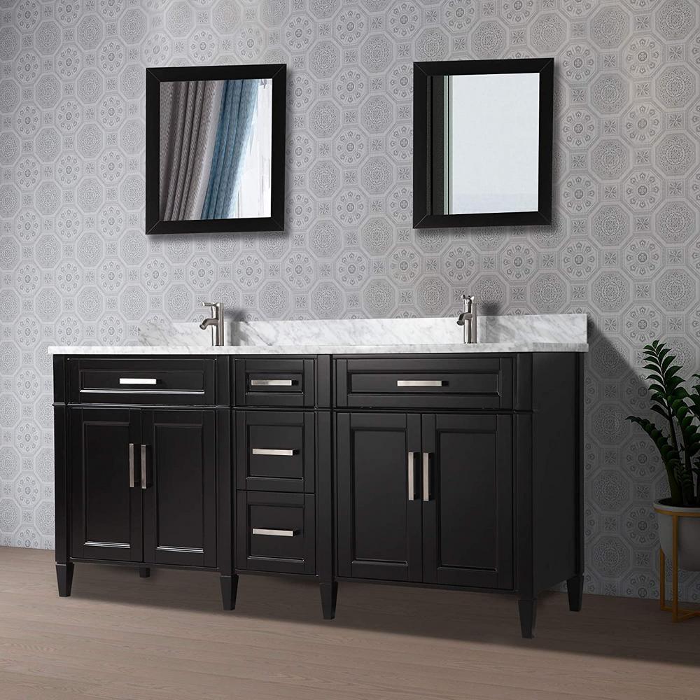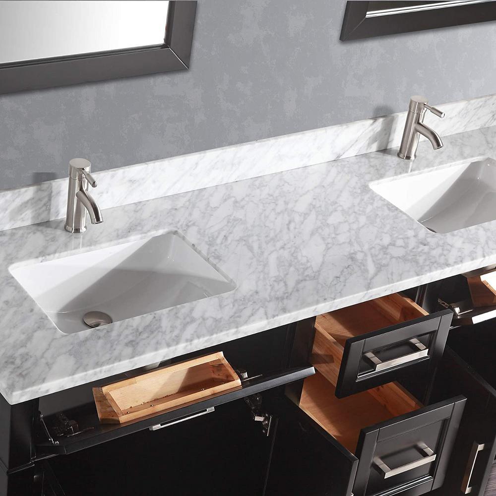 This modern 72 in. double sink bathroom vanity set with Carrara marble vanity top is a perfect combination of elegance and value. The soft-closing doors and drawers add another touch of class. The vanity set includes the vanity, sink, top, mirror and cabinet hardware.