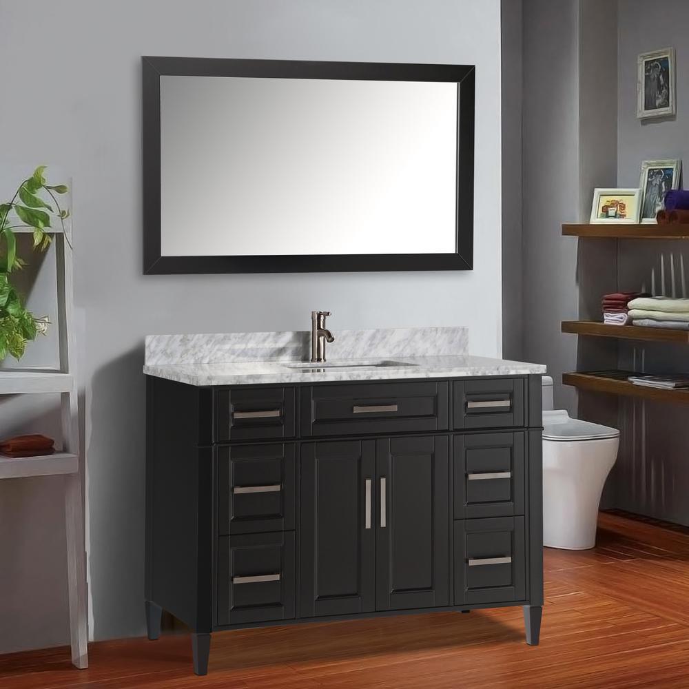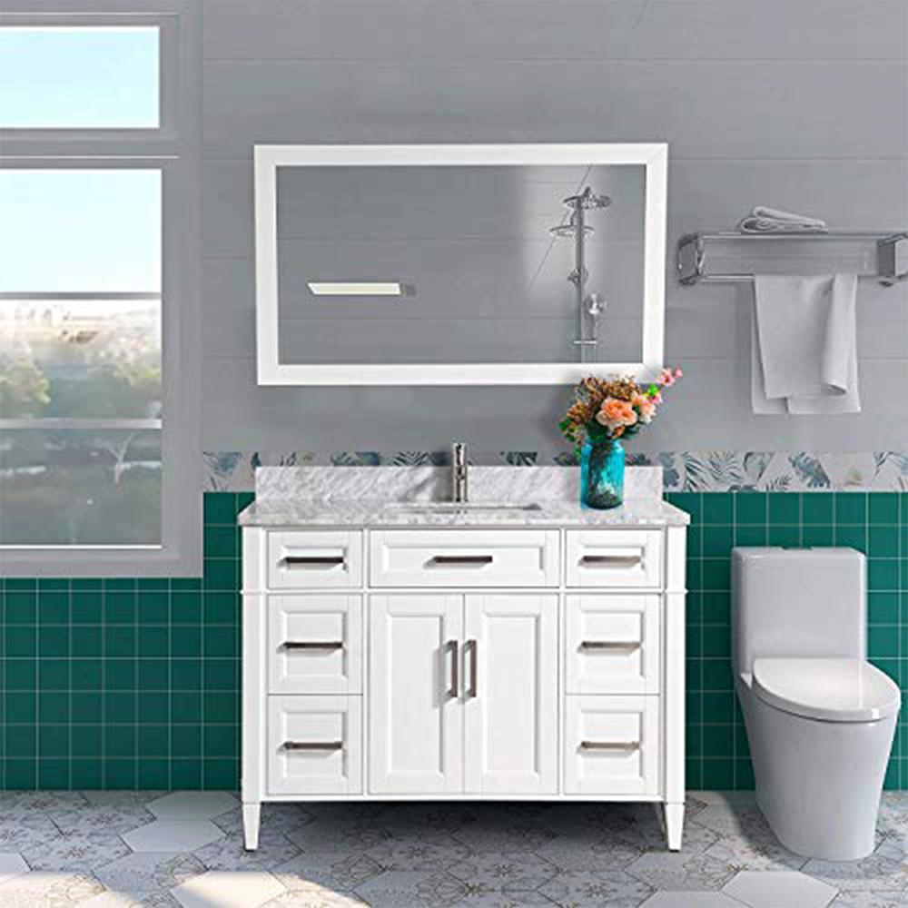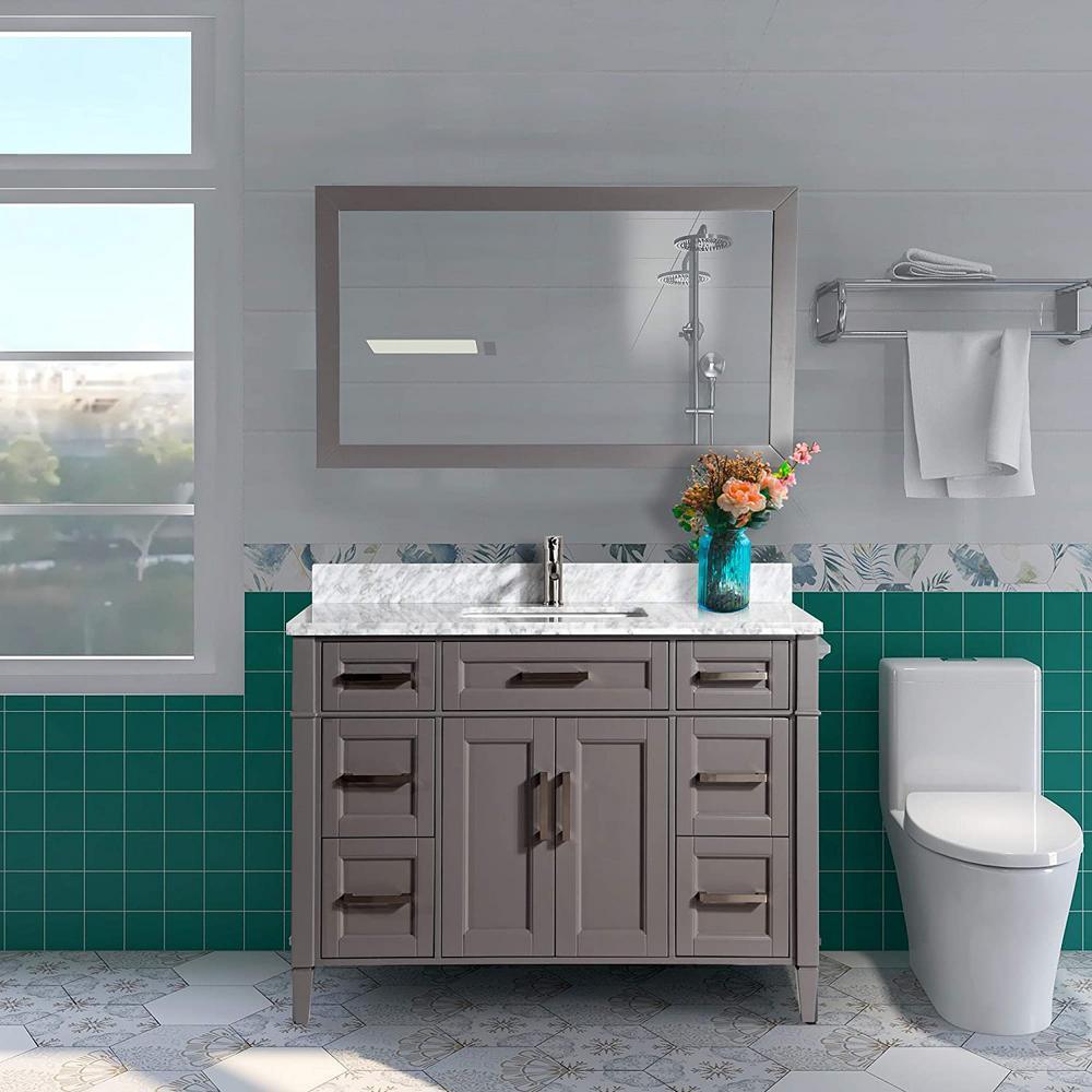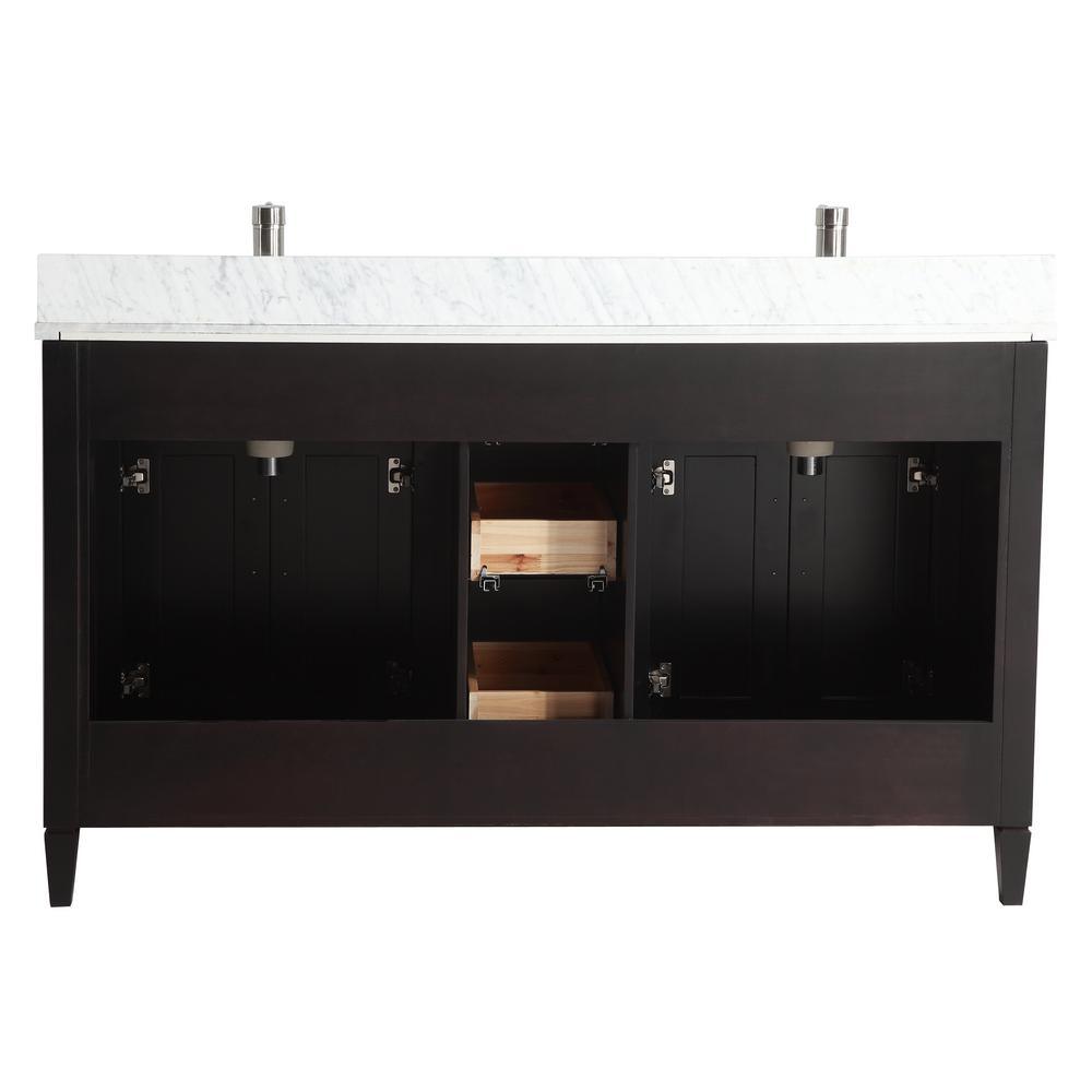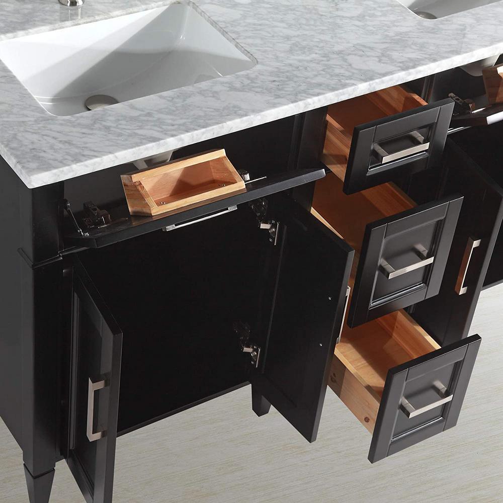 This modern 72 in. double sink bathroom vanity set with Carrara marble vanity top is a perfect combination of elegance and value. The soft-closing doors and drawers add another touch of class. The vanity set includes the vanity, sink, top, mirror and cabinet hardware.