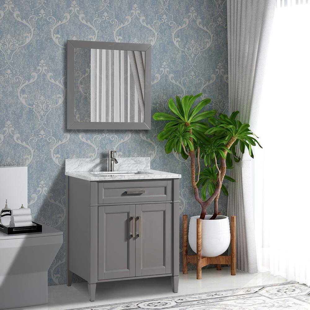 • White with grey Carrara marble top and oak and plywood vanity cabinet are a perfect combination