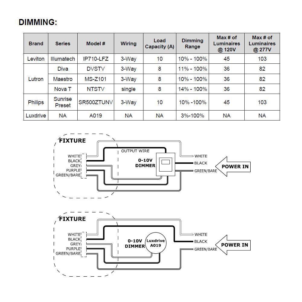 • 10-100% dimming range with Lutron or Leviton 0-10-Volt dimmers