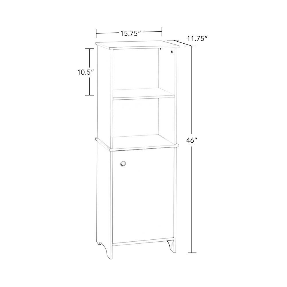 Add functionality and appeal to small spaces with this RiverRidge Tall Floor Cabinet. The open and top shelves can be used to display towels or home decor, while the enclosed cabinet below helps tidy up clutter. The interior shelf is adjustable allowing for customer storage and organization options. Perfect for small spaces such as a bathroom, dorm rooms or apartments. Additional dimensions: Top Open Shelf: 13.88 in. W x 10.75 in. D x 10.5 in. H; Bottom Open Shelf: 13.88 in. W x 11.19 in. D x 10.5 in. H; Interior Middle/Bottom Shelves: 14 in. W x 9.88 in. D.