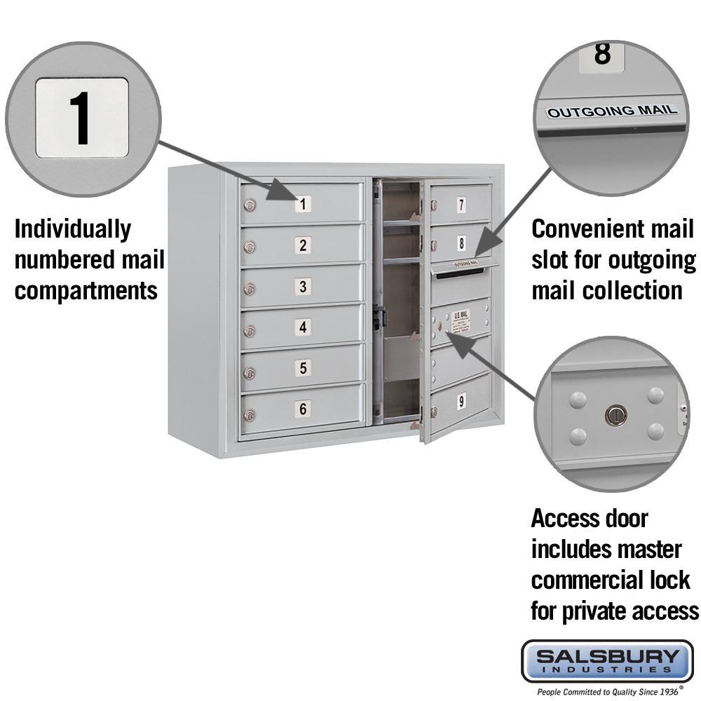 Constructed of heavy duty aluminum and stainless steel hardware, Salsbury 3800 series surface mounted 4C mailboxes can be accessed from the front through two (2) easy opening master door panels. These units provide a convenient means of installing 4C horizontal mailboxes in locations where walls cannot accommodate a recessed mounted installation. These 4C surface mounted horizontal mailboxes are durable and corrosion resistant that can be used indoors or outdoors and feature a powder coated finish in aluminum, bronze, gold and sandstone. All mailbox doors include a heavy-duty cam lock with a dust/rain shield and includes three (3) keys. A compartment equivalent to two (2) 3.25 in. high standard mailbox doors is used for outgoing mail collection and is labeled "Outgoing Mail". The outgoing mail compartment includes a weather protection flap, mail slot and carrier access door, which includes master commercial locks with two (2) keys for private access, and anti-fish plate on rear of mail slot to prevent tampering of outgoing mail. These surface mounted 4C horizontal mailboxes are ideal when private centralized mail delivery is desired. Ideal for apartments, condominiums, commercial buildings, residential developments, colleges, schools, private postal centers, corporate mail centers, military bases, government agencies and many other applications. Salsbury Industries is an ISO 9001: 2008 certified company and has excelled in the field of manufacturing since 1936.