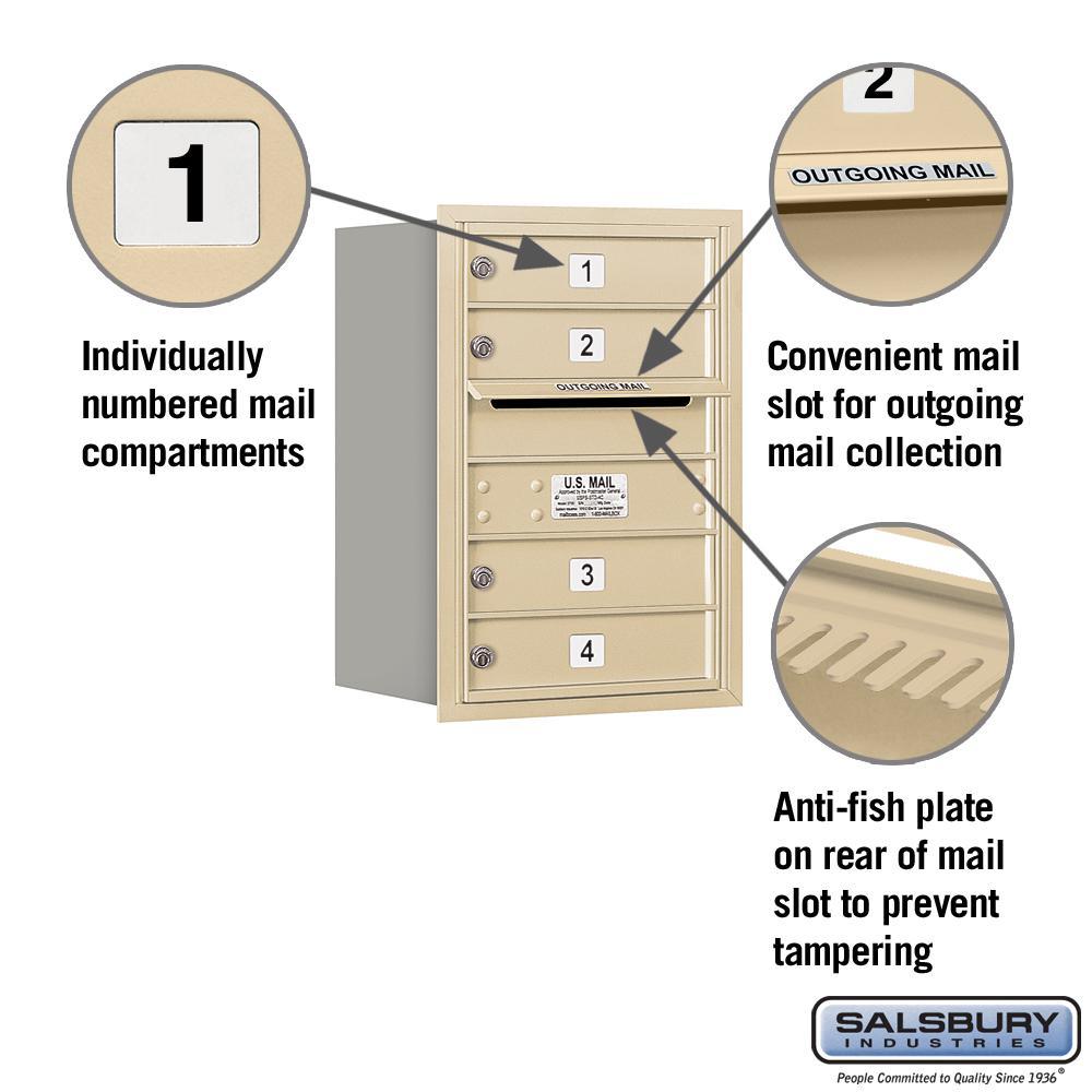Constructed of heavy duty aluminum and stainless steel hardware, Salsbury 3700 series high security recessed mounted 4C mailboxes can be accessed from the rear. These units provide a convenient means of installing 4C horizontal mailboxes in locations where walls can accommodate a recessed mounted installation. The recessed mounted mailboxes are durable and corrosion resistant that can be used indoors or outdoors and feature a powder coated finish in aluminum, bronze, gold and sandstone. All mailbox doors include a heavy-duty cam lock with a dust/rain shield and includes three (3) keys. The outgoing mail compartment includes a weather protection flap, mail slot and carrier access door, which includes master commercial locks with two (2) keys for private access, and anti-fish plate on rear of mail slot to prevent tampering of outgoing mail. Ideal when private centralized mail delivery is desired for apartments, condominiums, commercial buildings, residential developments, colleges, schools, private postal centers, corporate mail centers, military bases, government agencies and many other applications. For U.S.P.S. delivery of mail, contact your local postmaster for approval. Salsbury Industries is an ISO 9001: 2008 certified company and has excelled in the field of manufacturing since 1936.