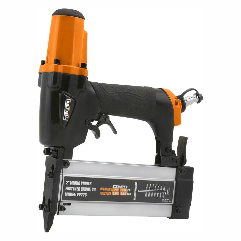 The Freeman PP23 23-Gauge 2 in. Micro Pinner with Case is as powerful and versatile as it is lightweight, making it ideal for DIY home improvement and repair projects as well as professional construction jobs. Applications such as fastening detailed trim, cabinetry trim, molding, muntin bars, picture frames, crafts, and more are perfect to tackle with this headless pin nailer. It has a no-mar tip allowing a nail to be put in tight spaces without leaving a mark on delicate trim. The magazine of this pneumatic nail gun is composed of anodized aluminum for lightweight durability, and the ergonomic body and comfort grip handle are made for ease of use over extended periods of time. This micro pinner comes equipped with a 360° adjustable exhaust to direct air away from your face, as well as a dual safety trigger to prevent accidental firing. This 23-Gauge nailer is exceptionally easy to load, and is compatible with 23-Gauge headless pins ranging from 5/8 in. to 2 in. The 23-Gauge 2 in. Micro Pinner includes a rugged plastic carry case, adjustment tools, lubrication oil, belt hook and is covered by Freeman's 7-Year Limited Warranty and 90-Day Wearable Parts Warranty.