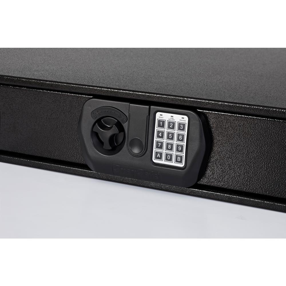 Store valuable belongings out of sight while maintaining easy access with the SnapSafe Under Bed Safe. The slide-out drawer accommodates firearms, jewelry, documents and more. The Under Bed Safe (Large) features a digital lock that can be programmed with a 3 to 8 digit access code, plus a key backup. The pry-resistant door keeps children and unauthorized users from gaining access. The safe is constructed of 14-Gauge heavy-duty steel, with pre-drilled bolt holes for permanent installation. A robust 5 ft. cable provides added security when anchored to a stationary object.