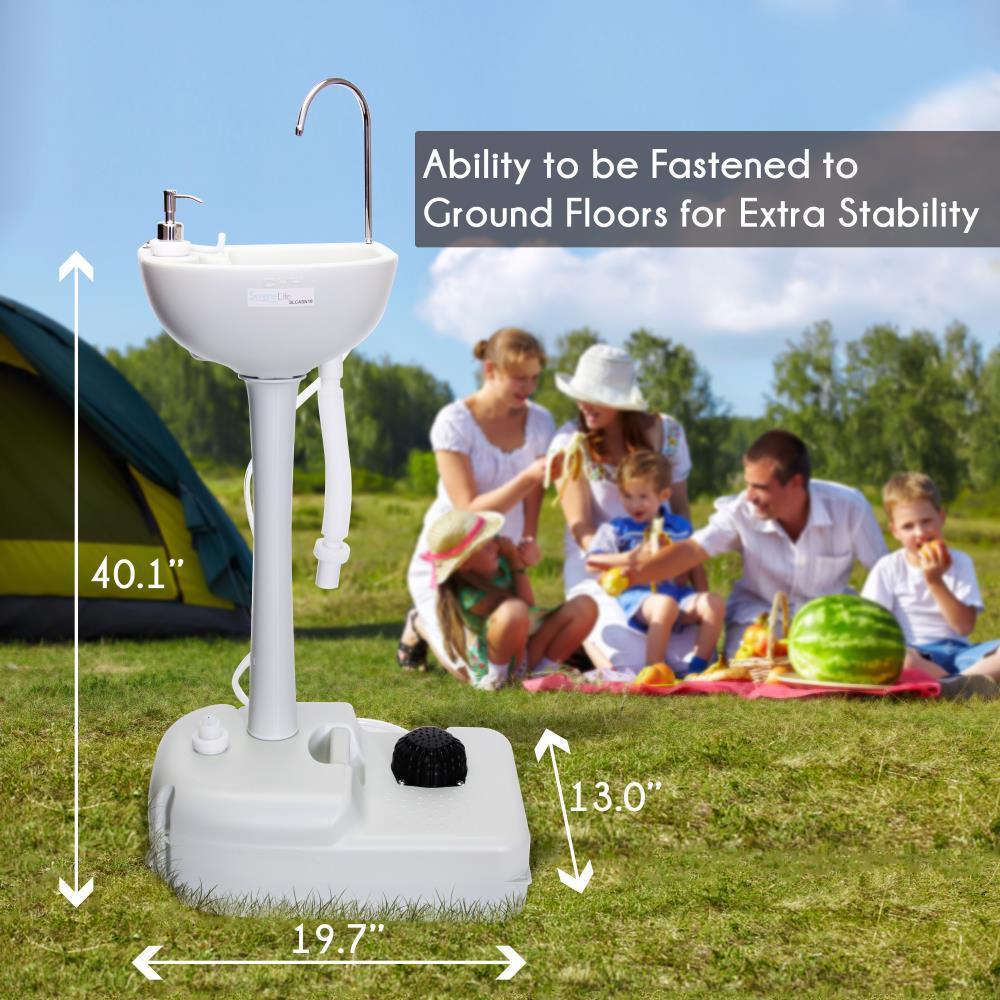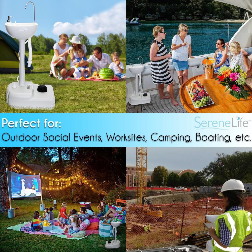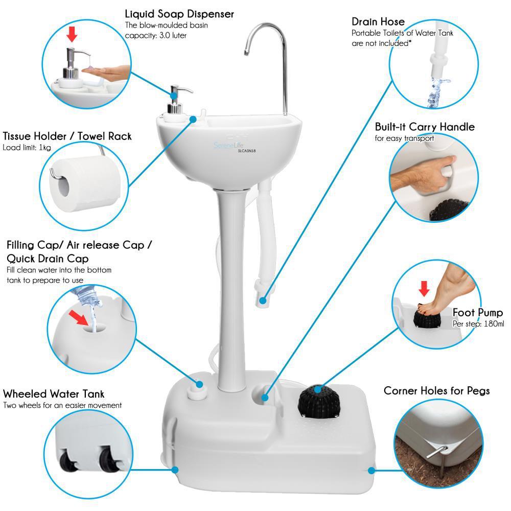 The Serene Life Portable Hand-Wash Sink / Faucet Station (5 plus Gallon Capacity) is a Compact and Portable Hand-Wash Sink Station. Quick Assemble Design for On-Site Setup, Simple and Hassle-Free Operation, Hands-Free Water Dispenser Activated via Foot Pump. Integrated Liquid Soap Dispenser - Rugged and Reliable Construction - Built-in Carry Handle and Rolling Wheels. Can Be Transported Even When Filled with Water - Stainless Steel Towel Holder - Includes Flexible Drainage Hose - Ability to be Fastened to Ground Floors for Extra Stability - Perfect for Outdoor Social Events, Worksites, Camping, Boating, etc. Bottom Water Tank Capacity: 19 l / 5 plus gallons - Foot Pump Dispenser Rate: 180 ml / per step - Liquid Soap Dispenser Capacity: 3 l.