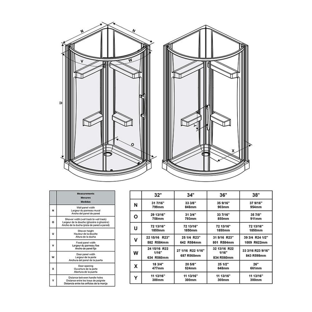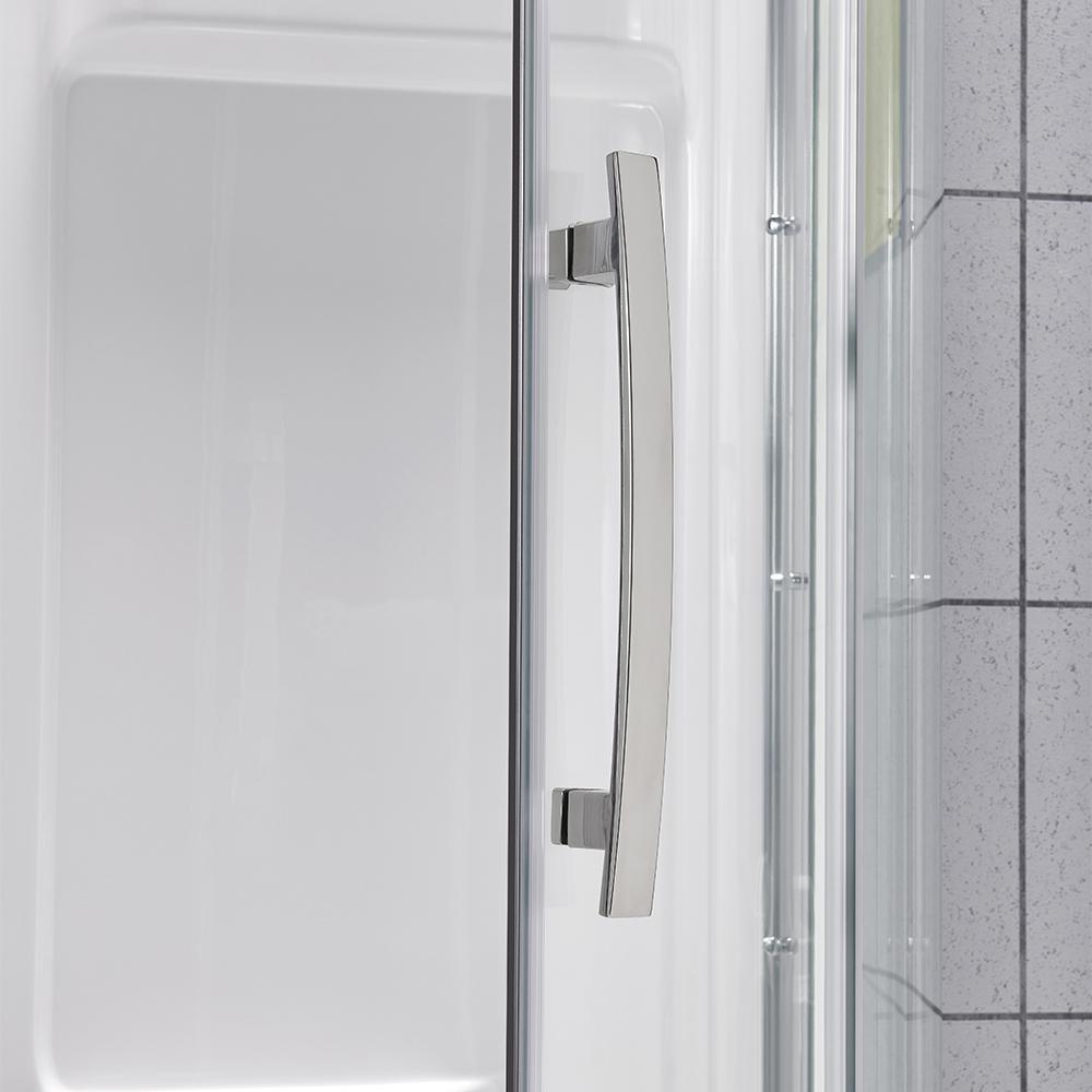Squeeze extra space out of your bathroom with the Maia 32 in. Corner Drain Corner Shower Kit by Glacier Bay. Four handy shelves, including two extra-deep ledges, are the perfect spot to stash a wide array of shampoos, body washes and more. Clear glass rounded sliding shower doors with chrome trim and a stylish oversized handle open smoothly and silently on premium rolling hardware. Pure white acrylic walls reinforced with fiber glass offer durable scratch and stain resistance, while a low-profile shower base threshold height allows easy access in and out.