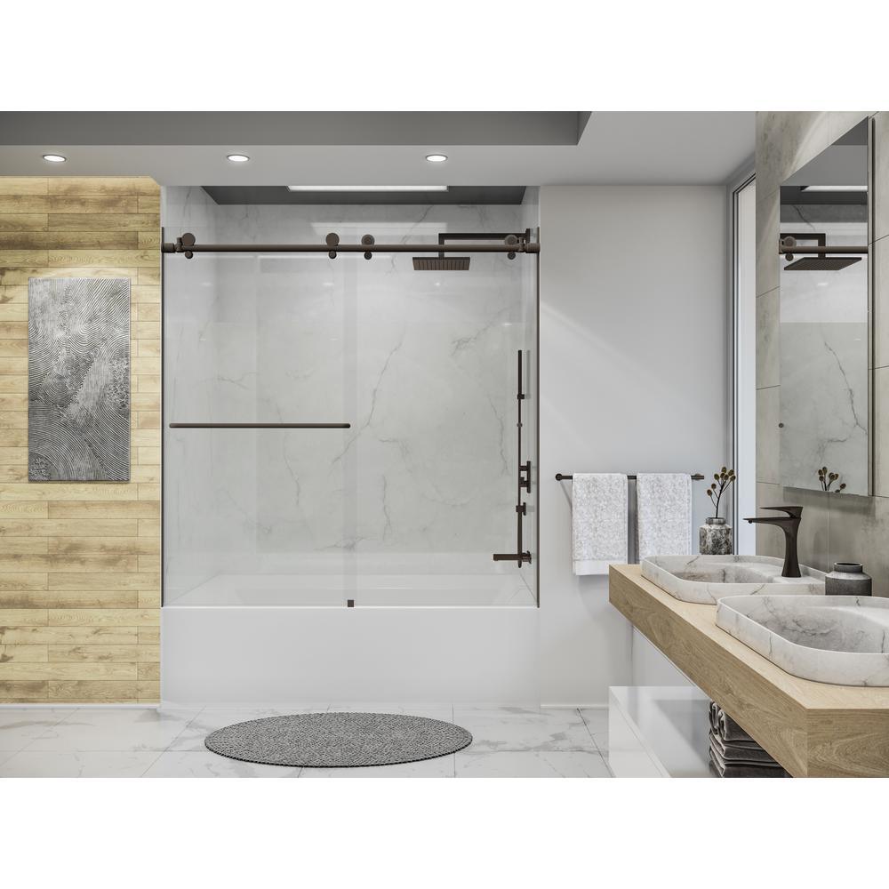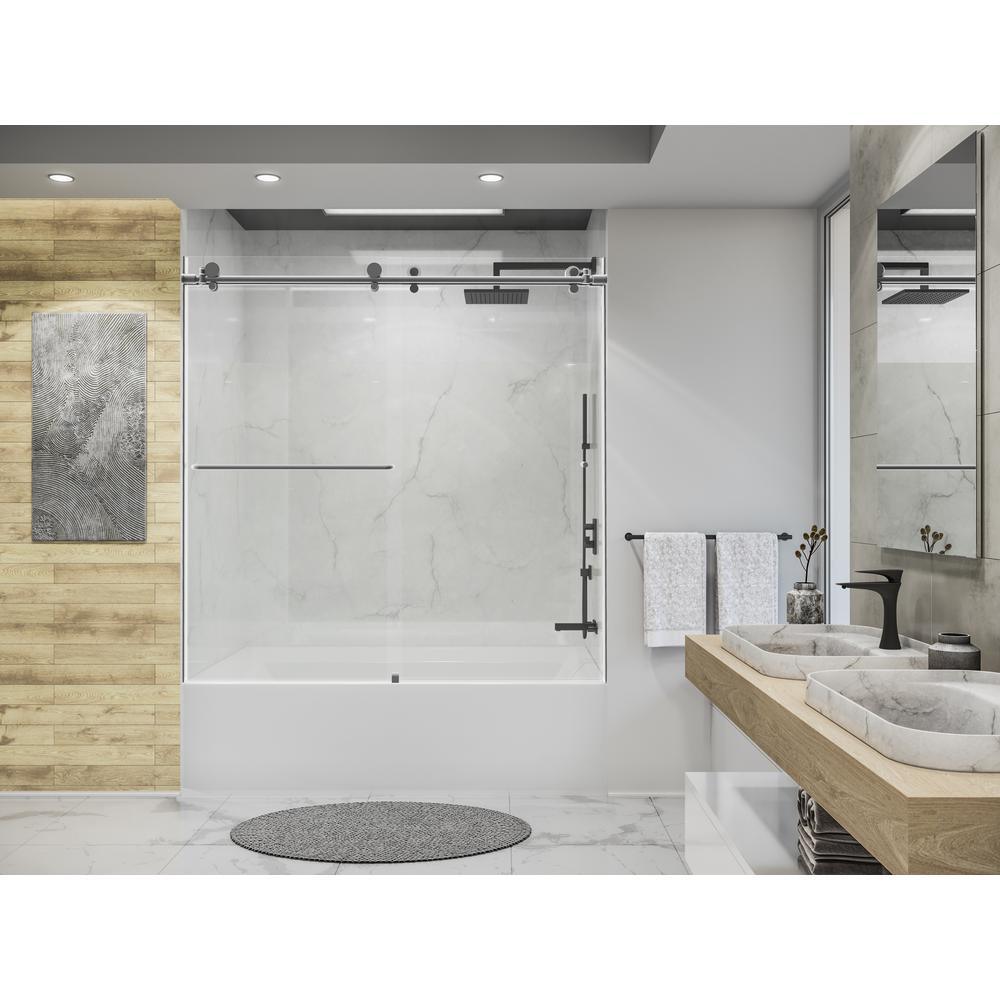 Refresh your bathroom with the sophisticated Eclipse double bypass sliding door. The frameless, barn-door style enclosure will enhance any space and the double-bypass doors allow for greater movement and functionality. The soft-sill threshold is flexible enough to allow wheelchairs to pass over it easily and soft enough to walk on painlessly.