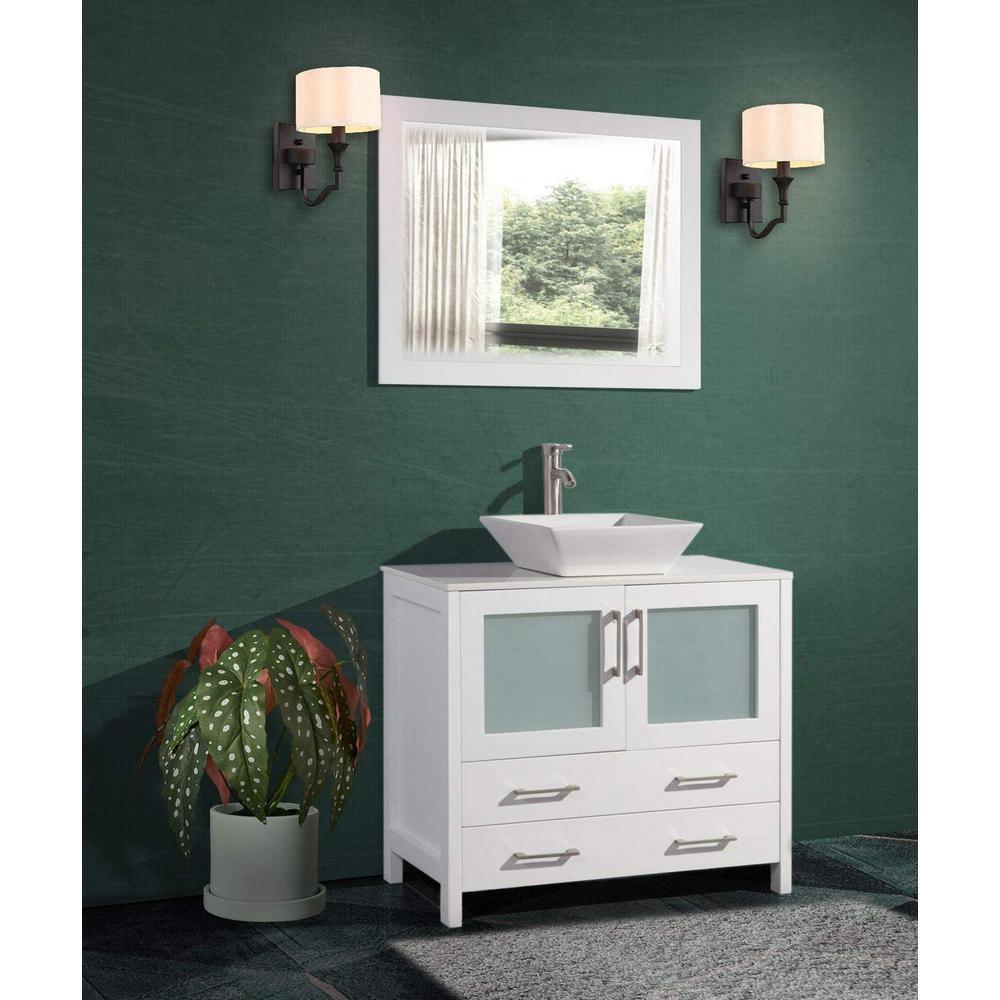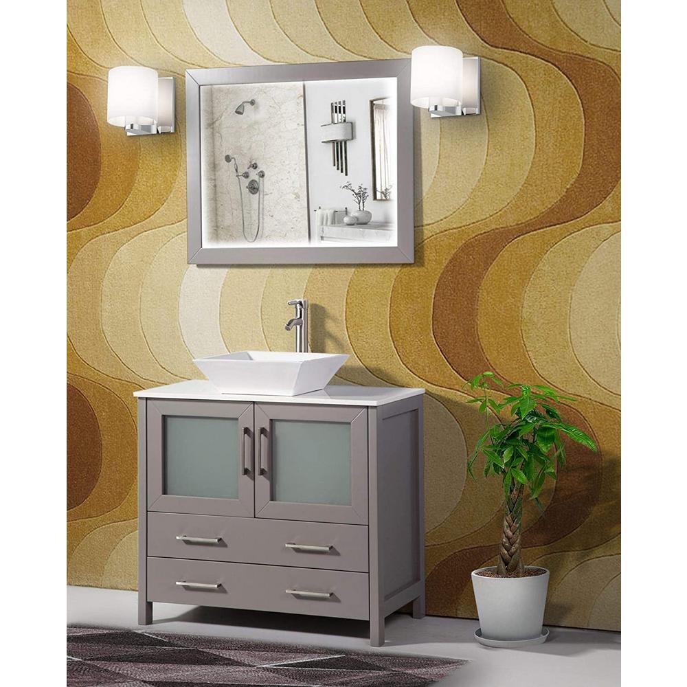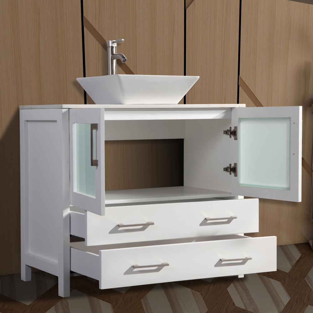 This modern 36 in. single sink bathroom vanity set with ceramic vanity top is a perfect combination of elegance and value. The soft-closing doors and drawers add another touch of class. The vanity set includes the vanity, sink, top, mirror and cabinet hardware.