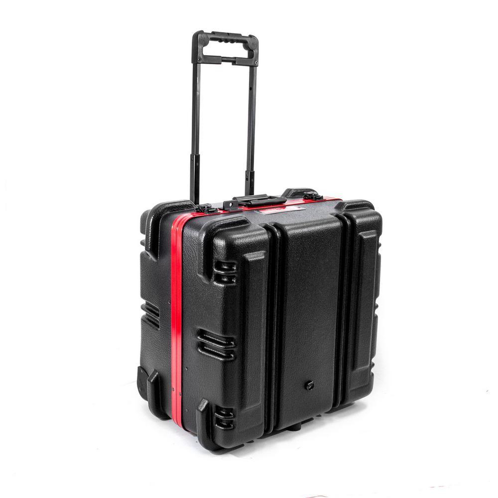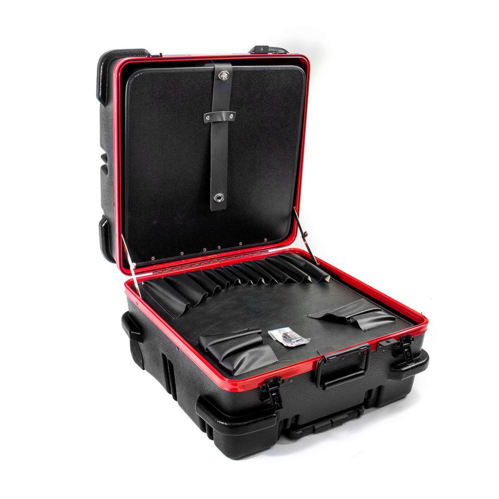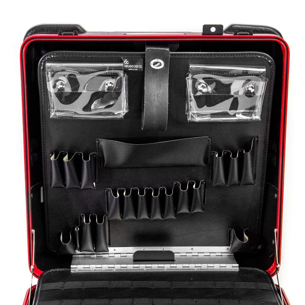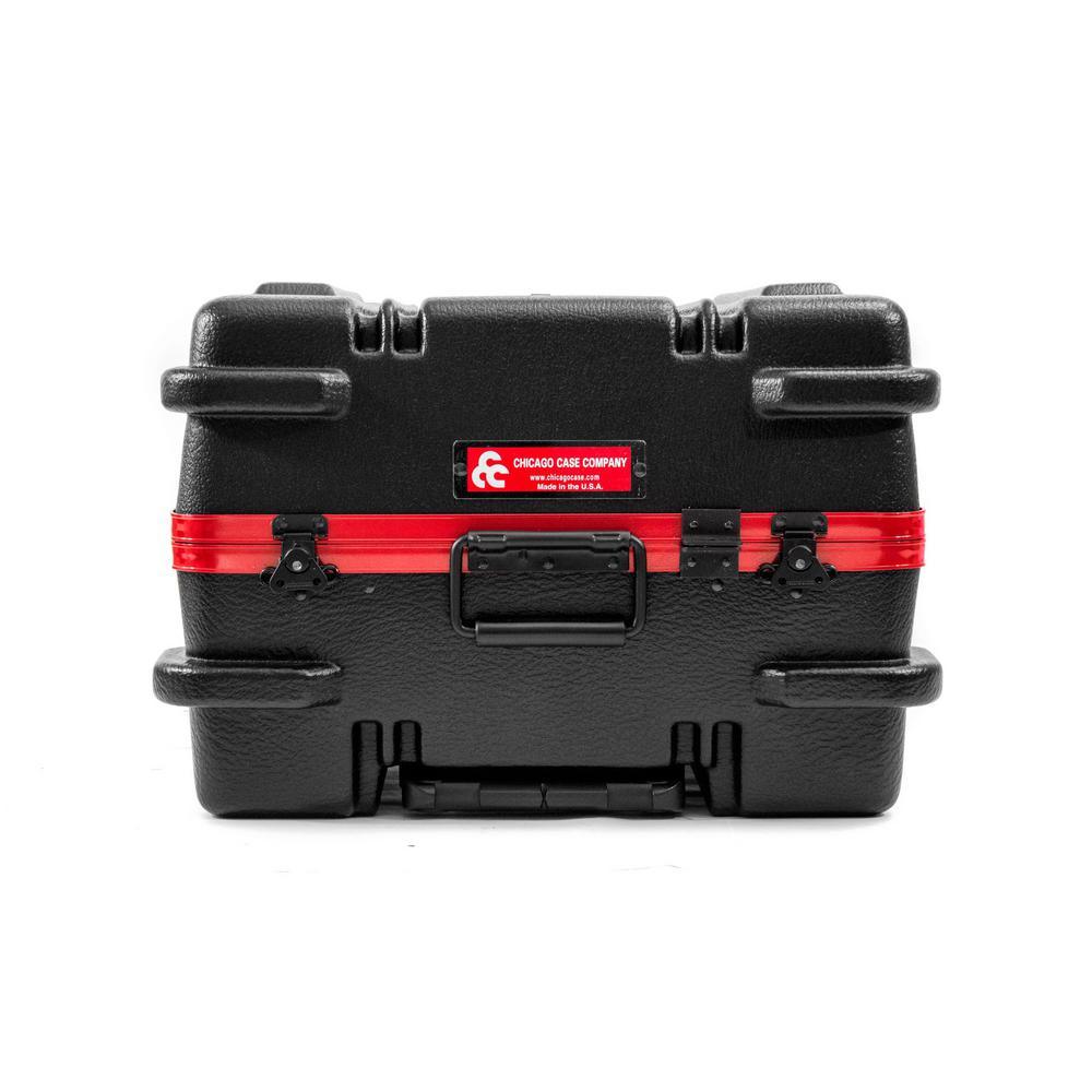 This Chicago Case military-style tool case with high-impact black polyethylene plastic, 25% thicker than our standard cases. This case offers a slimline profile of 12.5 in. verses normal 15.0 in. from front-to-back. It has an aluminum tongue-in-groove frame to resist dirt and moisture and features 8 external protective bumpers. The case includes our unique V-hinged top pallet with bottom pallet to hold more than 60 tools (not included), a TSA approved 3-digit combination lock and plank foam in the base. Tool case capacity is approximately 70 lbs. to 75 lbs. This case is part of our Red Line Premium Military-Style Tool Case line and comes with a red tongue-in-groove frame and red wheels.
