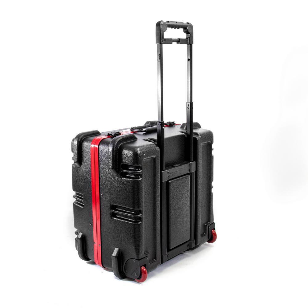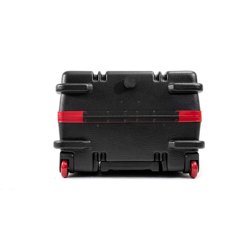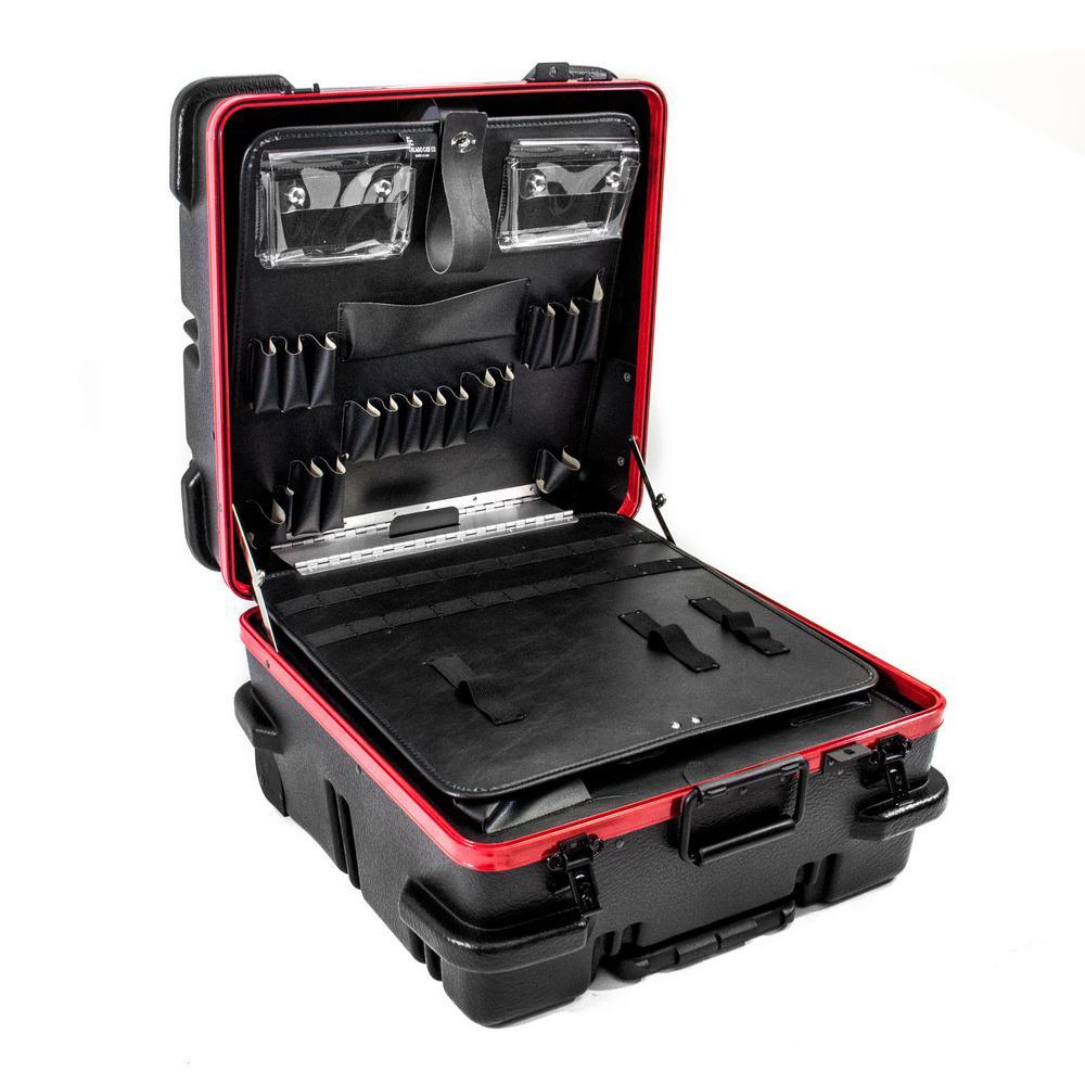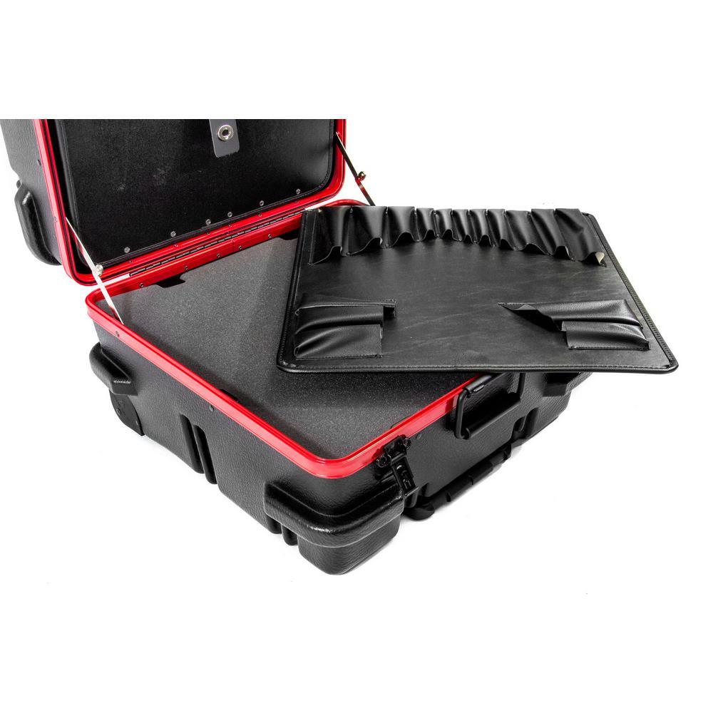 This Chicago Case military-style tool case with high-impact black polyethylene plastic, 25% thicker than our standard cases. This case offers a slimline profile of 12.5 in. verses normal 15.0 in. from front-to-back. It has an aluminum tongue-in-groove frame to resist dirt and moisture and features 8 external protective bumpers. The case includes our unique V-hinged top pallet with bottom pallet to hold more than 60 tools (not included), a TSA approved 3-digit combination lock and plank foam in the base. Tool case capacity is approximately 70 lbs. to 75 lbs. This case is part of our Red Line Premium Military-Style Tool Case line and comes with a red tongue-in-groove frame and red wheels.