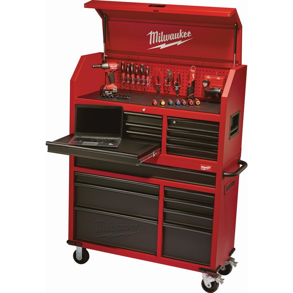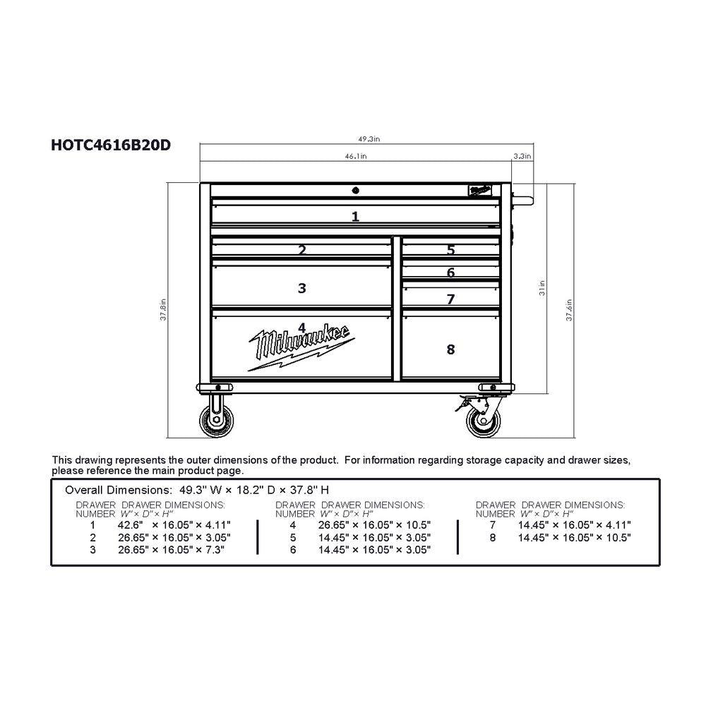 Keep your garage neat with the Milwaukee 46 in. 8-Drawer Roller Cabinet Tool Chest in Red. Excellent for heavy use, it features a 20-Gauge steel construction to ensure toughness and structural integrity. This tool storage system has 8-drawers 4 small, 3 medium and 1 large and features a total holding capacity of 15,160 cu. in. offering you plenty of storage for all your equipment. Designed to accommodate heavy loads, it comes with ball bearing slides that can hold up to 100 lbs.so you can easily access the contents of the unit. With the power tool drawer, you can store your larger equipment. This Milwaukee tool cabinet has a barrel key internal locking system to offer you peace of mind. It is designed with fixed and swivel casters that support up to 1,800 lbs. and features a push handle, making it easy to maneuver around. Redefine your tool organization with the Milwaukee 46 in. 8-Drawer Roller Cabinet Tool Chest in Red.