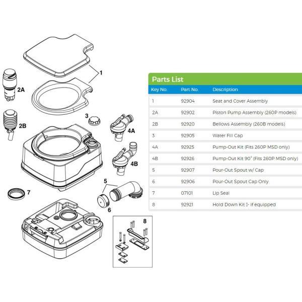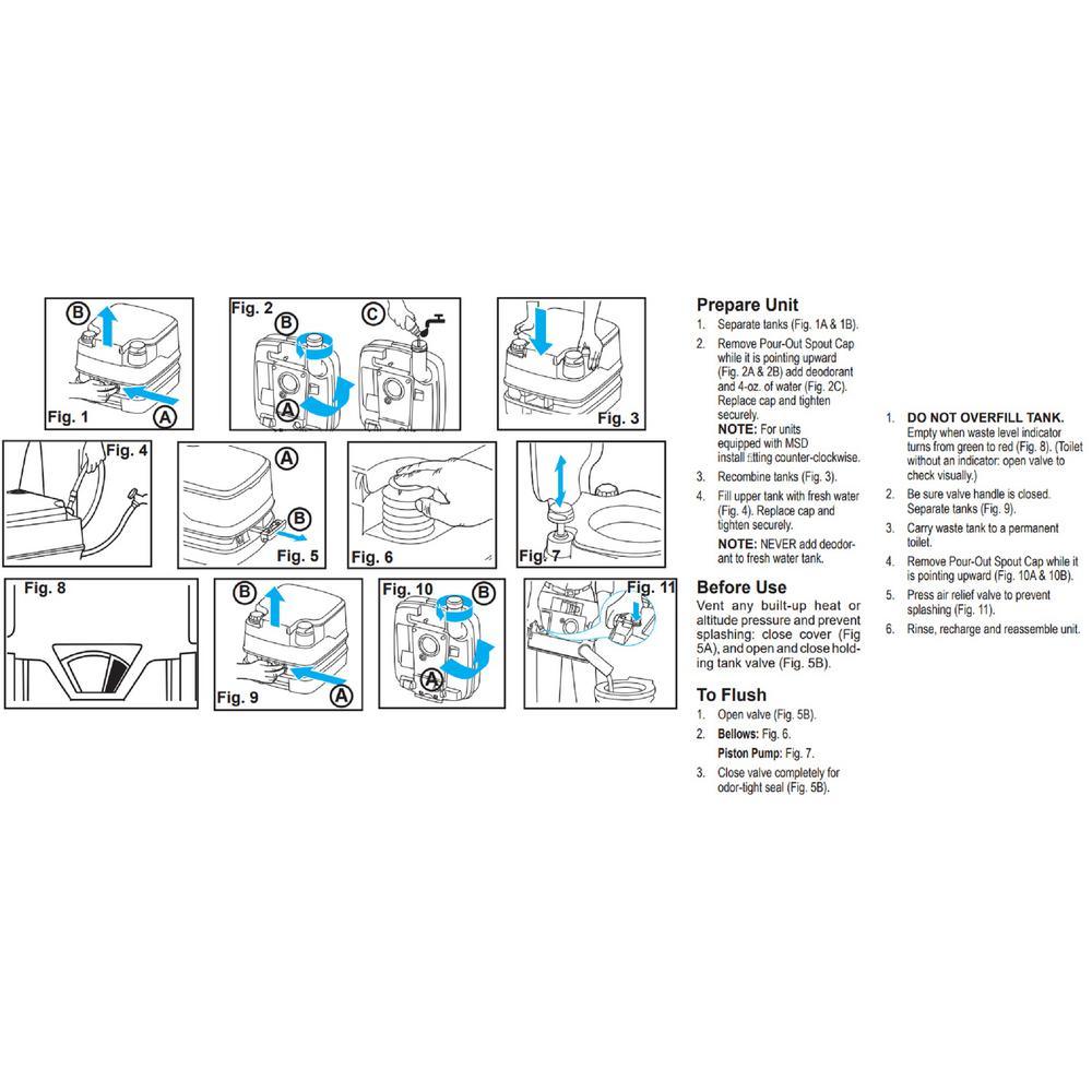 Durable toilet is sanitary, odorless, leakproof and easy to clean. The valve handle, fill cap and pump are designed for easy use and good looks. Features include: piston pump, exclusive rotating pour-out spout (92865 only), removable seat and cover for easy cleaning, lid latch, ergonomic water tank carrying handle, sealed valve to keep odors in holding tank, built-in deodorant storage (bottle included), and a hold down kit to secure toilet to deck. MSD model includes connections for direct overboard, dockside pump out, or remote tank discharge. Does not include a pour spout.92865: replaces Model 735 - #2510492868: replaces Model 735 MSD - #25105.