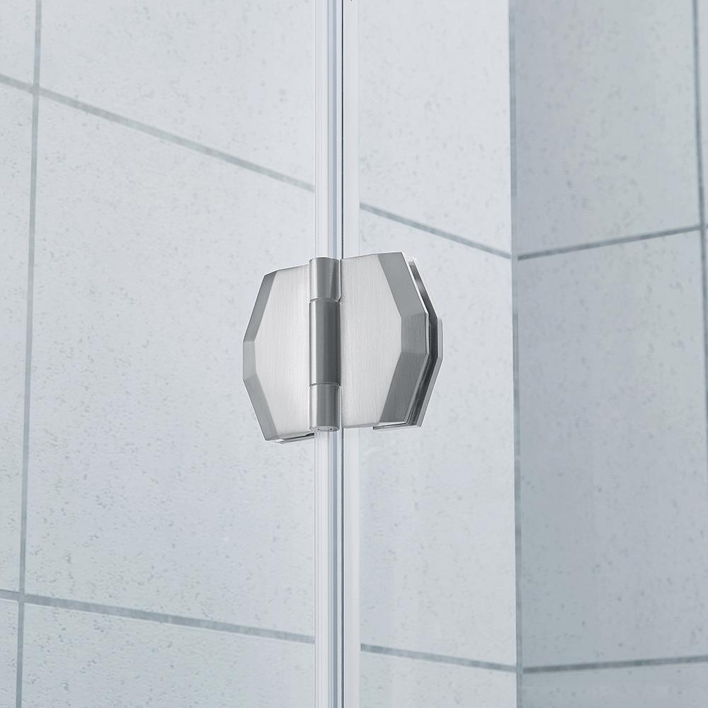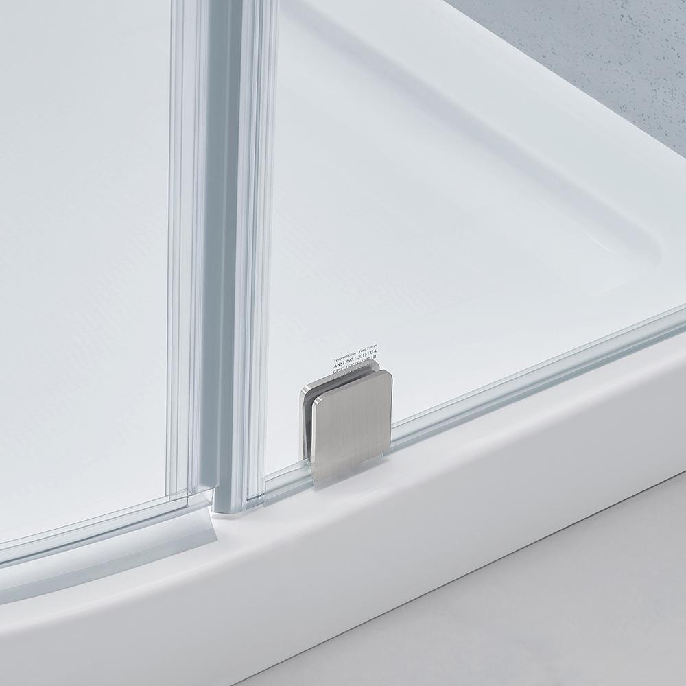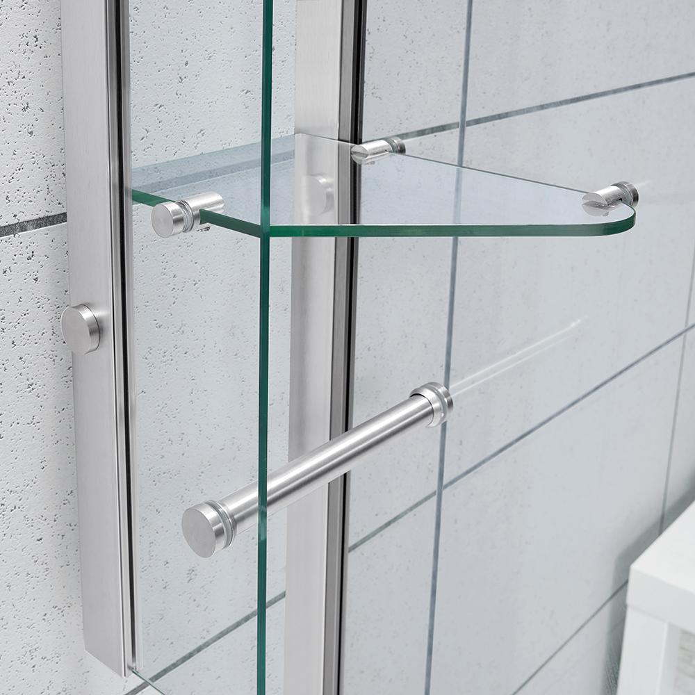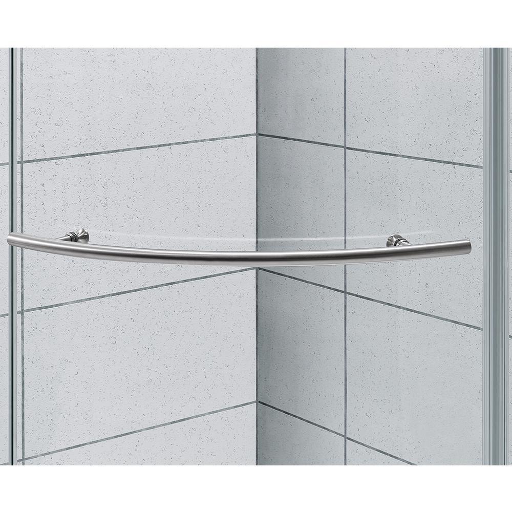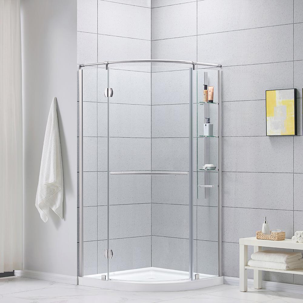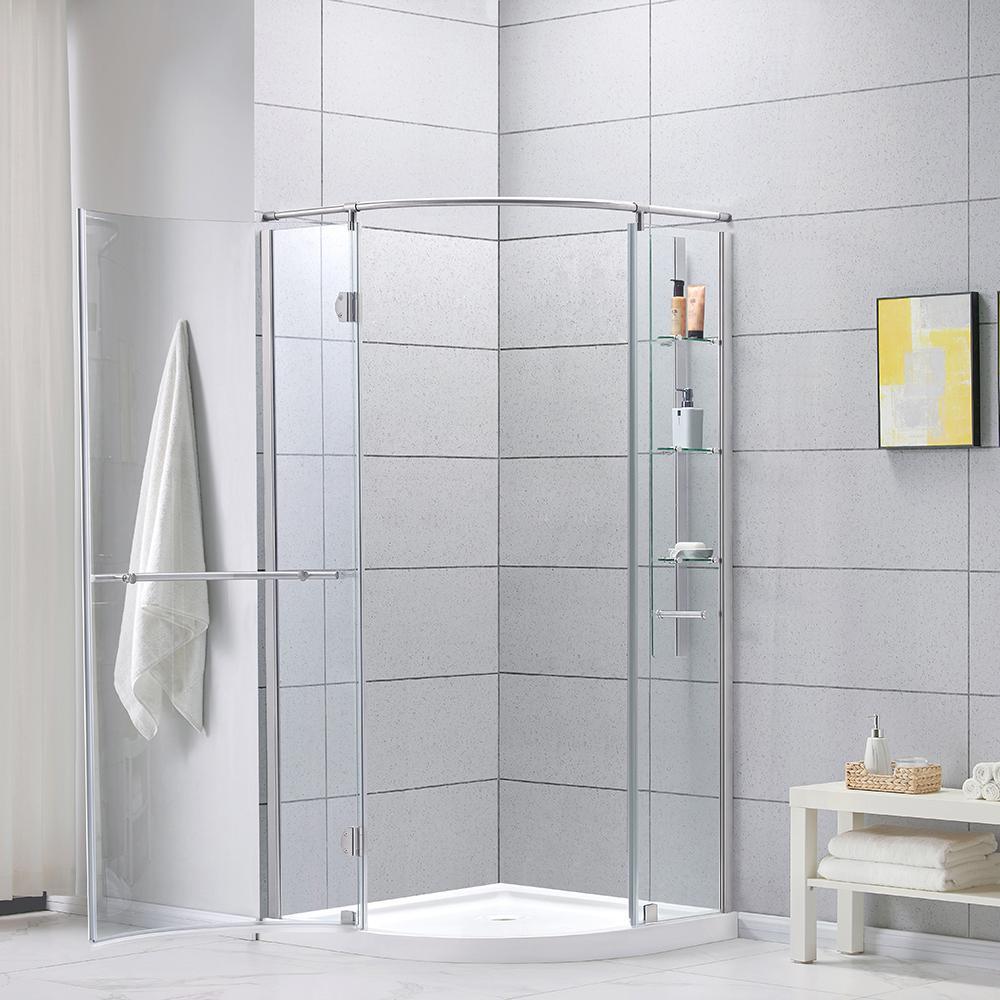 Add some glam to your life with the luxurious Glamour 38 in. Semi-Frameless Round Corner Shower kit by Glacier Bay. Its stunningly curved pivoting glass door is hugged by the echoing curves of a wide horizontal satin nickel handle and matching support rail - perfect for showing off your bathroom's beautiful tile. Smart storage starts with three clever suspended glass corner shelves plus a satin nickel washcloth hanger. Kit includes the low profile base in classic white, with your choice of right or left door installation, for a 1-stop solution to your bathroom renovation.