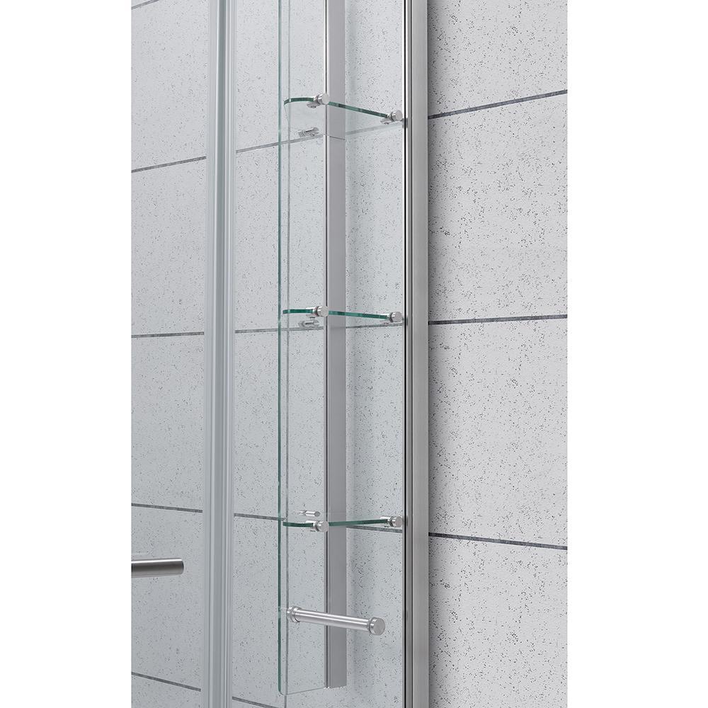 • Smart built-in storage, with three glass corner shelves and chrome washcloth hanger bar