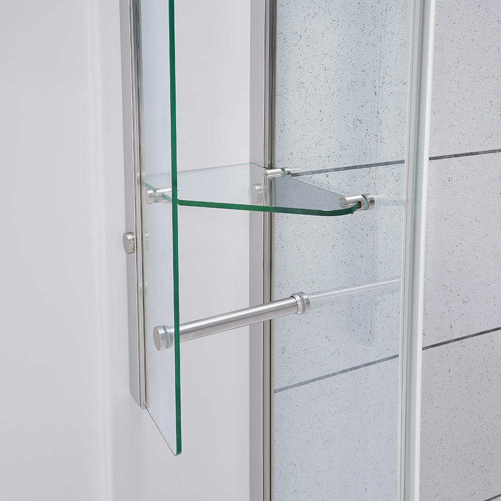 • Smart built-in storage, with 3 glass corner shelves and satin nickel washcloth hanger bar