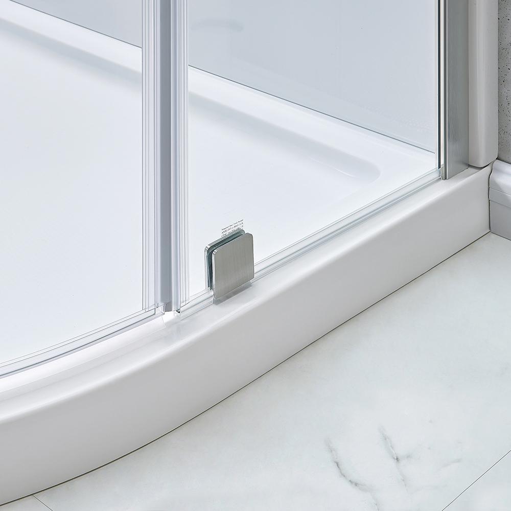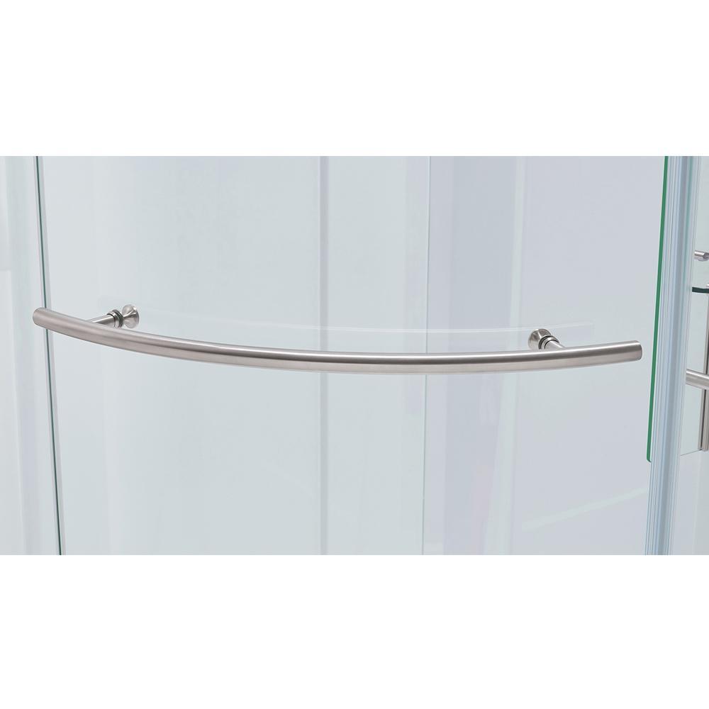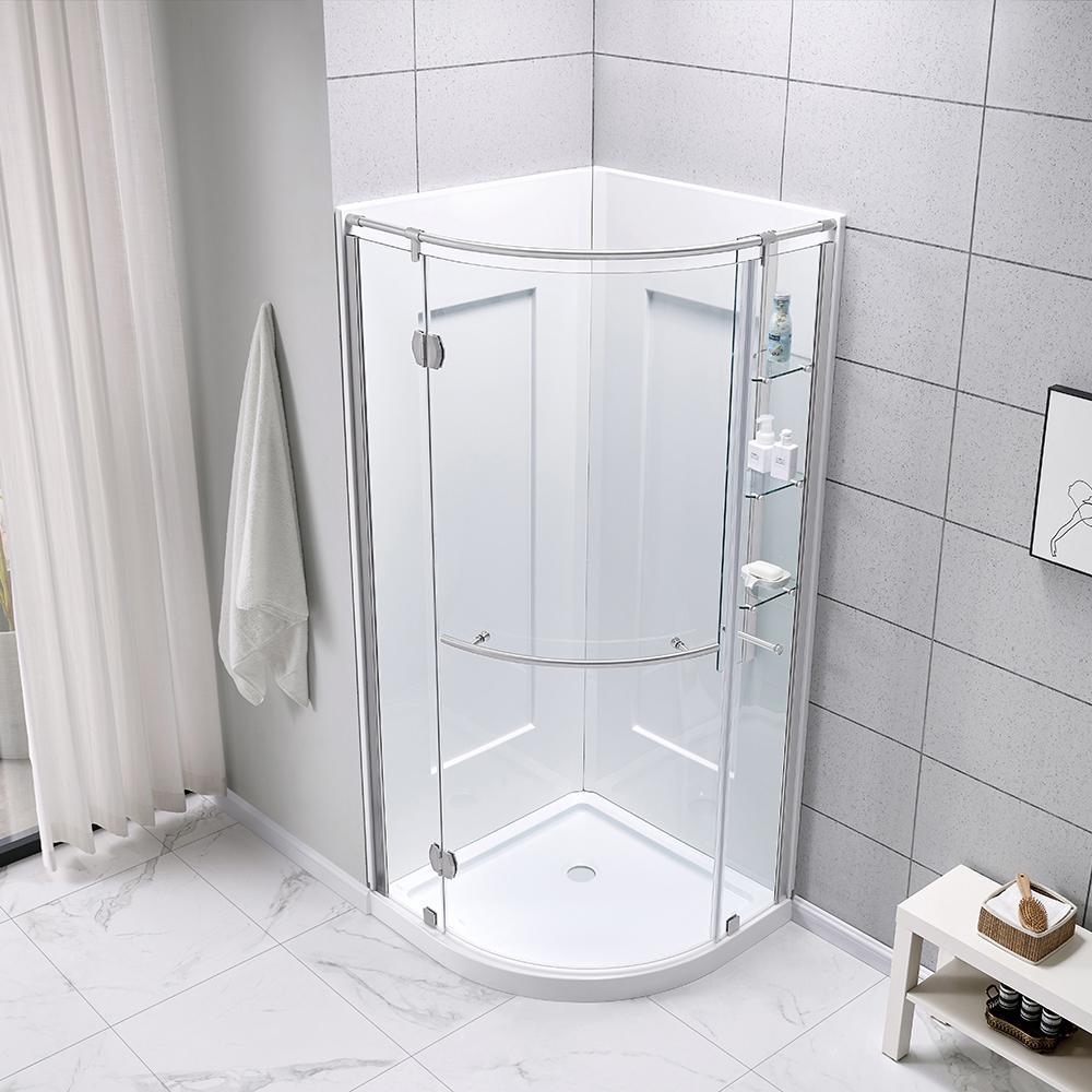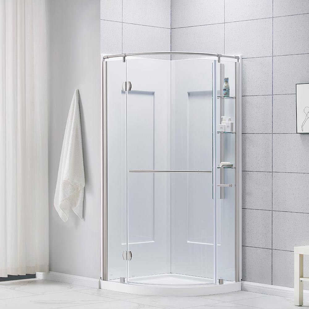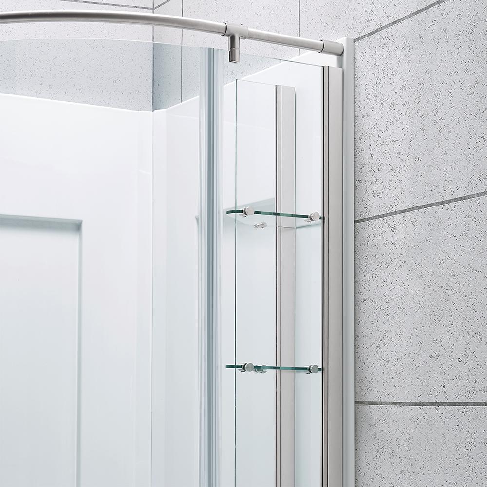 Add some glam to your life with the luxurious Glamour 32 in. semi-frameless round corner shower kit by Glacier Bay. Its stunningly curved pivoting glass door is hugged by the echoing curves of a wide horizontal satin nickel handle and striking top satin nickel support rail. Smart storage starts with three clever suspended glass corner shelves plus a satin nickel washcloth hanger. Kit includes the acrylic shower walls plus low profile base in classic white, with your choice of right or left door installation, for a one-stop solution to your bathroom renovation.