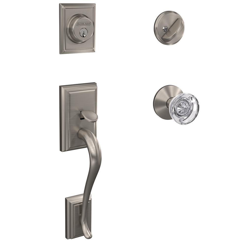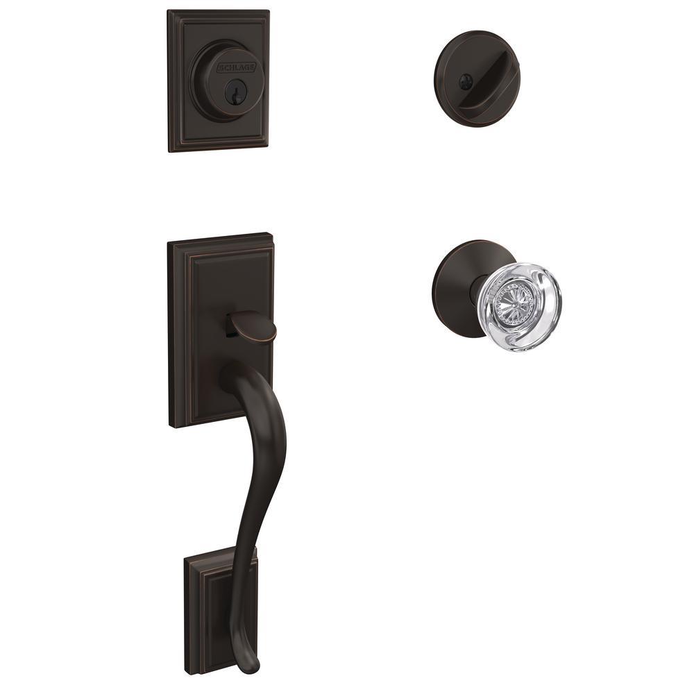 The ultimate in entryway style, the Schlage Custom Addison Single Cylinder Handle set and Interior Hobson Glass Knob with Kinsler Trim in Matte Black makes your front door unforgettable. Low profile interior trim creates a high-style designer look. The Hobson glass knob is the perfect high-end statement piece for styles ranging from traditional to eclectic transitional, while the Addison grip trim's distinguished look incorporates subtle details without losing its classic simplicity. The striking appearance of the Matte Black finish creates an elegant look that trim's sure to be noticed in any style setting. Coordinate the style and finish of your homes door hardware inside and out by pairing with Schlage Custom interior door hardware.