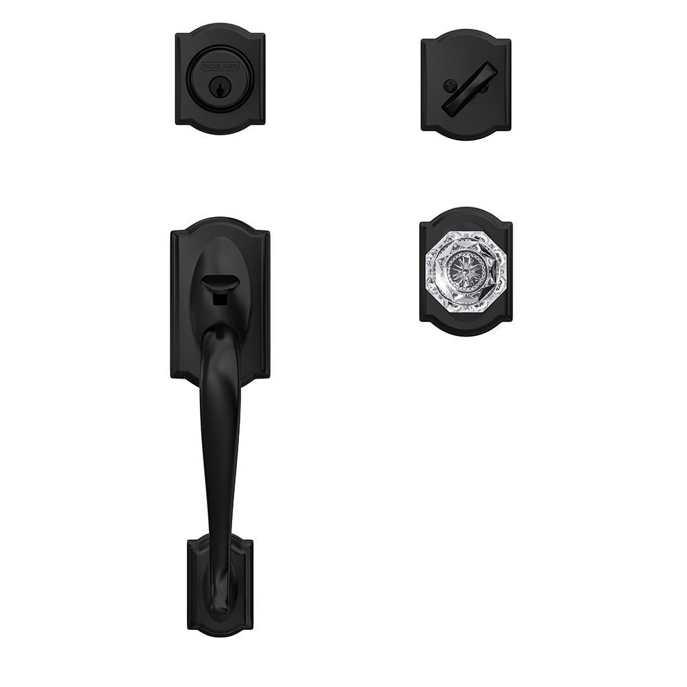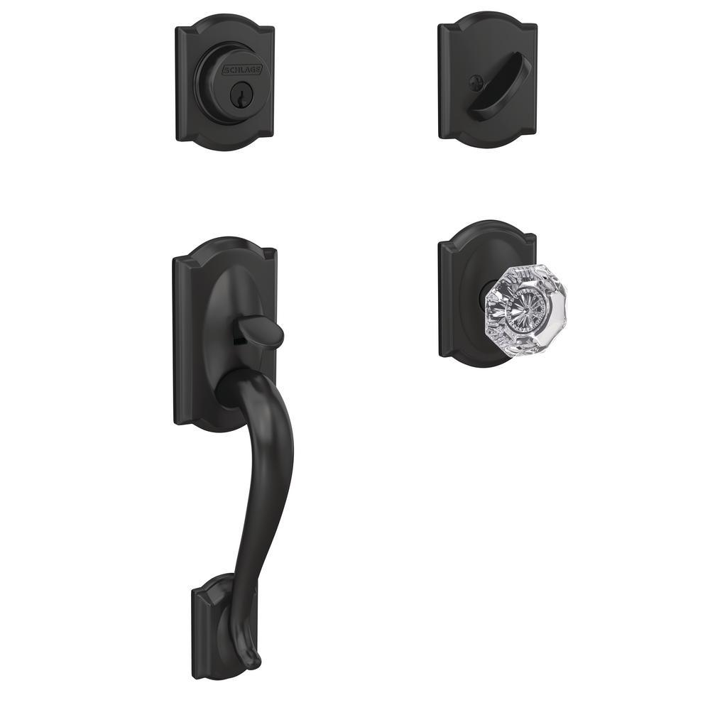 The ultimate in entryway style, the Schlage Custom Camelot Single Cylinder Handle set and Interior Alexandria Glass Knob with Camelot Trim in Matte Black makes your front door unforgettable. Low profile interior trim creates a high-style designer look. Inspired by the Victorian era, the Alexandria glass knob is multi-faceted with classic detailing sparkling in the center, while the Camelot grip trim's scalloped architectural details make any room charming and approachable. The striking appearance of the Matte Black finish creates an elegant look that trim's sure to be noticed in any style setting. Coordinate the style and finish of your homes door hardware inside and out by pairing with Schlage Custom interior door hardware.