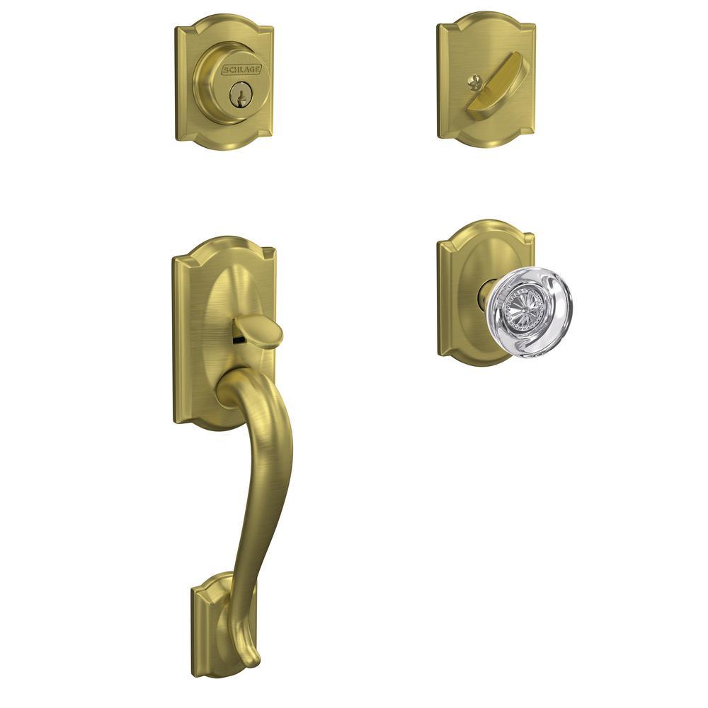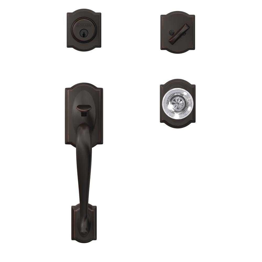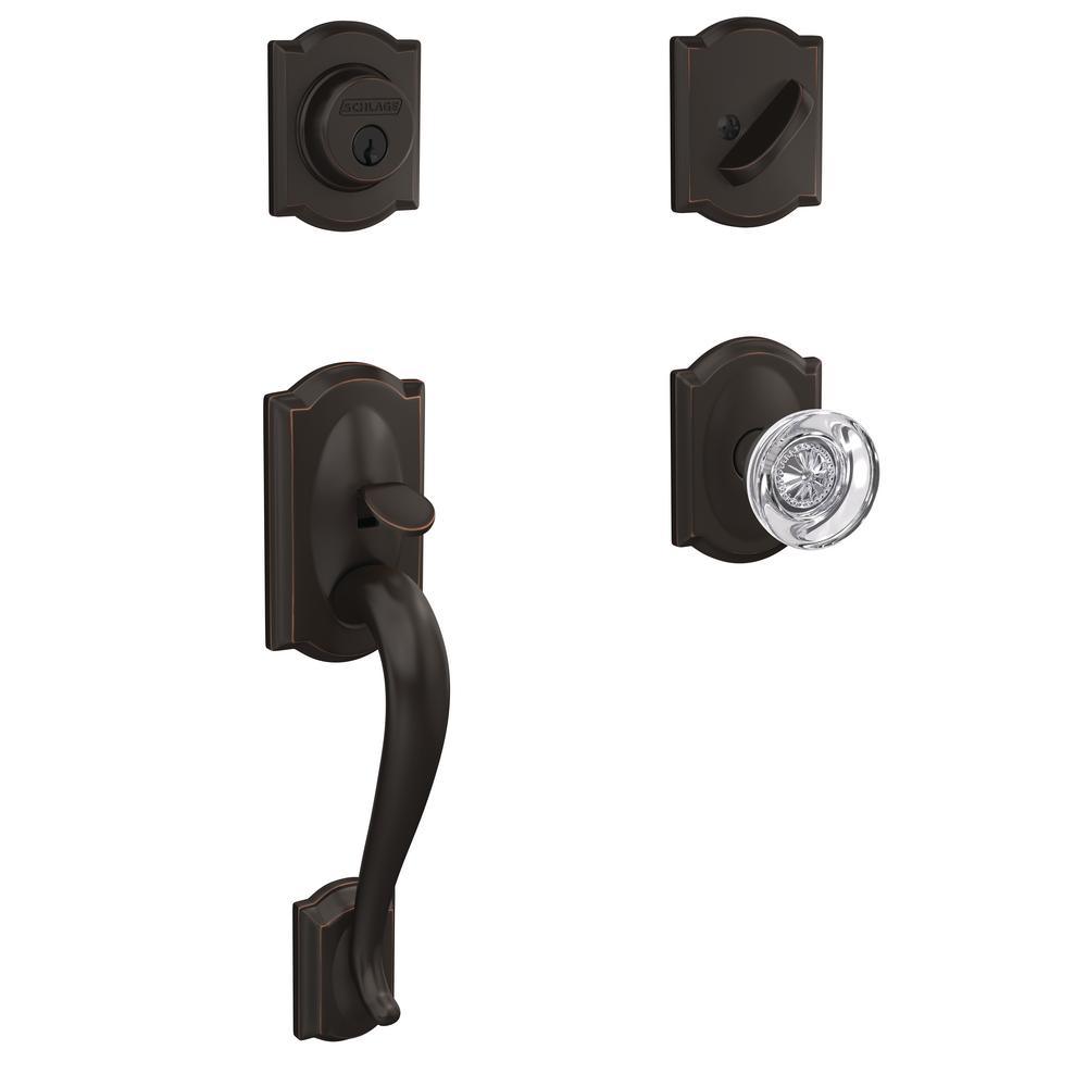 The ultimate in entryway style, the Schlage Custom Camelot Single Cylinder Handle set and Interior Hobson Glass Knob with Camelot Trim in Aged Bronze makes your front door unforgettable. Low profile interior trim creates a high-style designer look. The Hobson glass knob is the perfect high-end statement piece for styles ranging from traditional to eclectic transitional, while the Camelot grip trim's scalloped architectural details make any room charming and approachable. The Aged Bronze finish is inspired by traditional design, featuring warm, copper tones that break through its darker, aged exterior. Coordinate the style and finish of your homes door hardware inside and out by pairing with Schlage Custom interior door hardware.