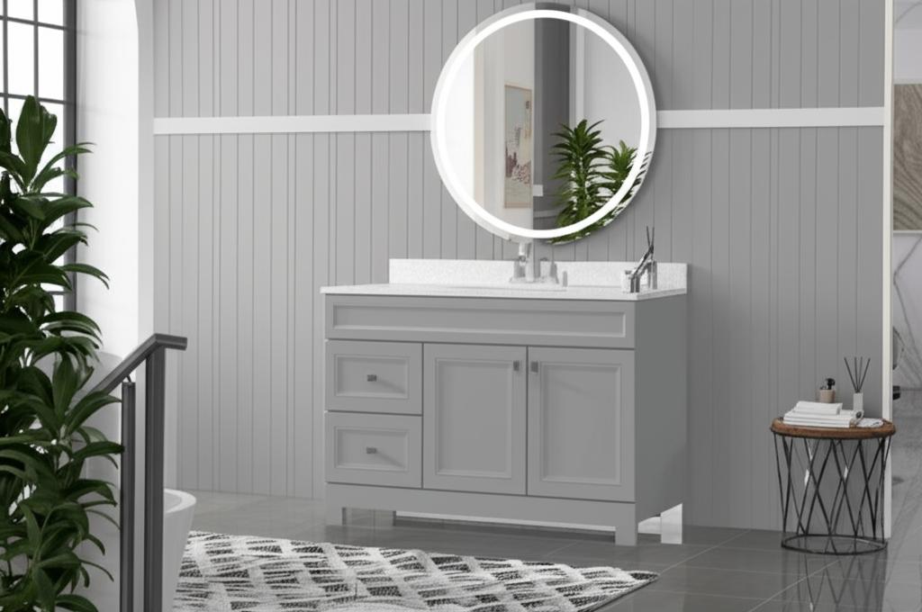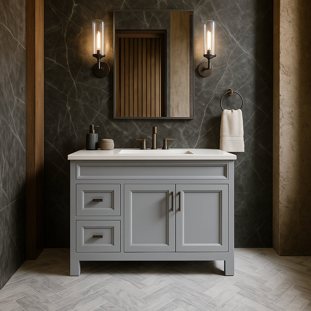 The Sedgewood 48.5-inch Bathroom Vanity combines style and functionality with its dove gray finish, Arctic solid surface top, and customizable drawer and door layout. Perfect for modern bathrooms.