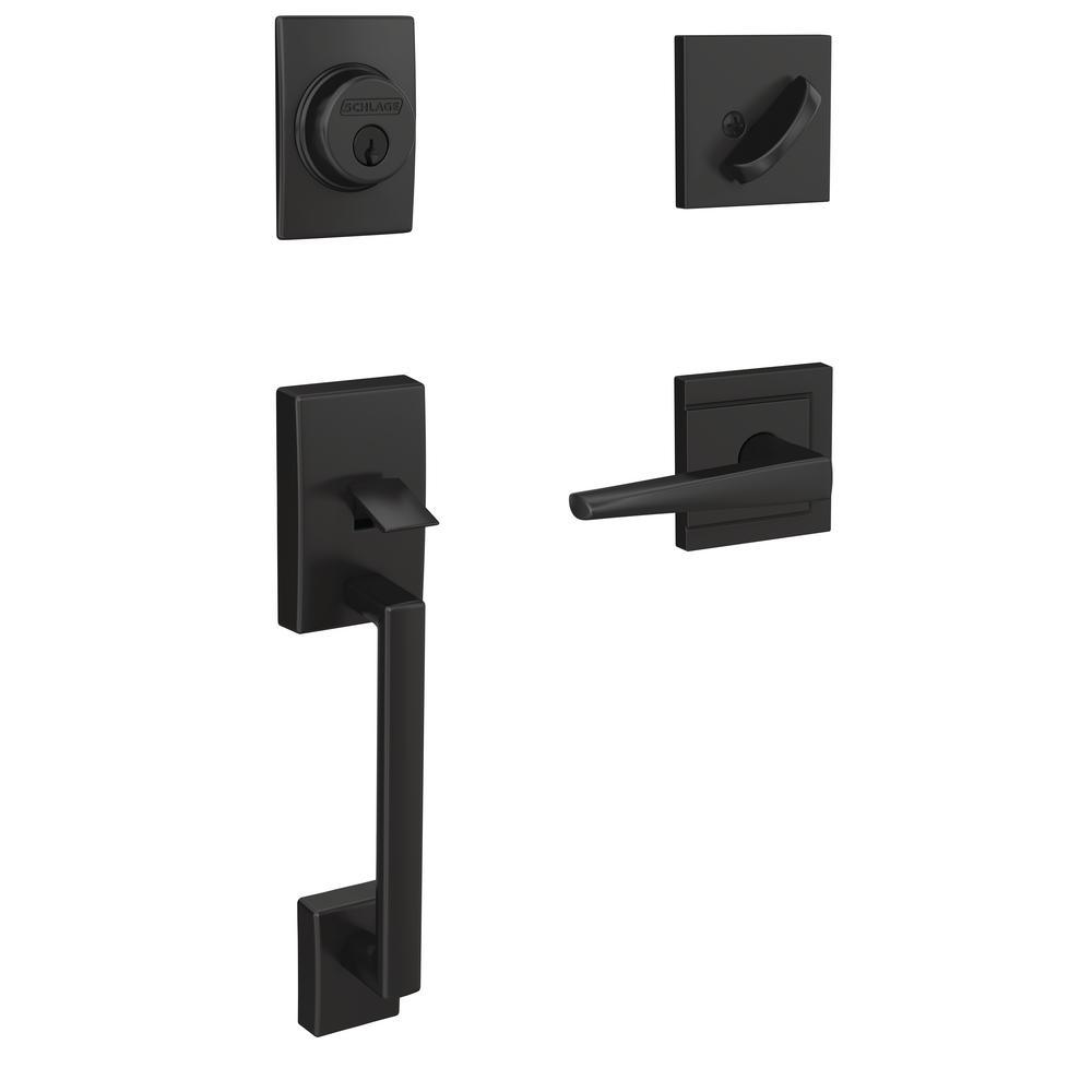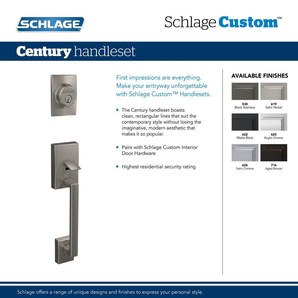 The ultimate in entryway style, the Schlage Custom Century Single Cylinder Handleset and Interior Eller Lever with Century Trim in Aged Bronze makes your front door unforgettable. Low profile interior trim creates a high-style designer look. The intrepid style of the Eller lever pairs the soft curves of Scandinavian design with the precise, clean surfaces of minimalism, while the Century grip is chic with a delicate, slightly curved shape. The Aged Bronze finish is inspired by traditional design, featuring warm, copper tones that break through its darker, aged exterior. Coordinate the style and finish of your homes door hardware inside and out by pairing with Schlage Custom interior door hardware.