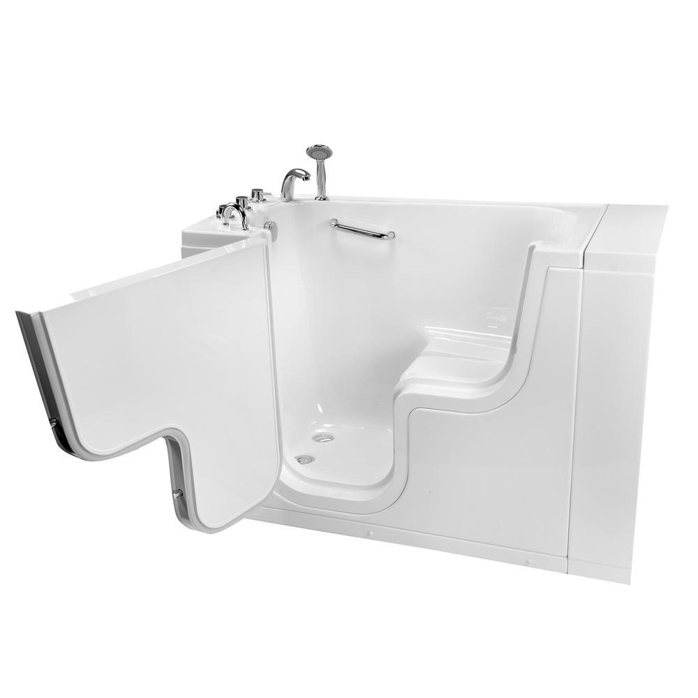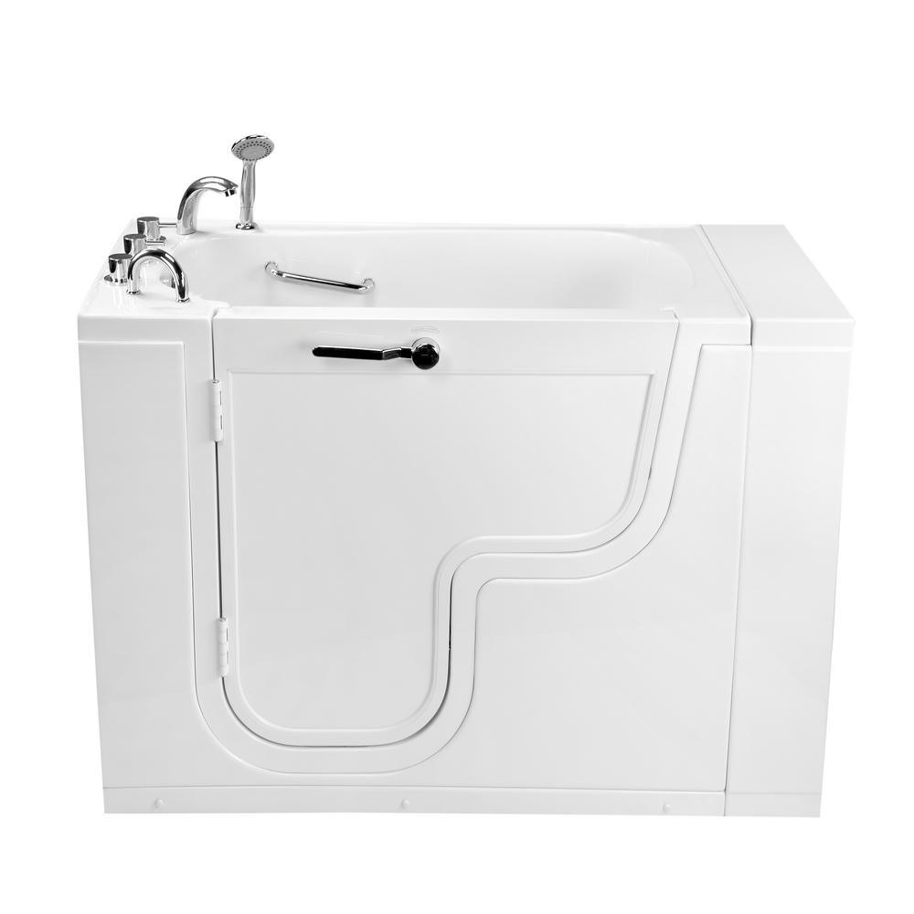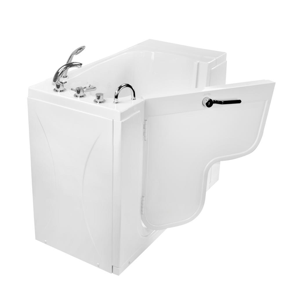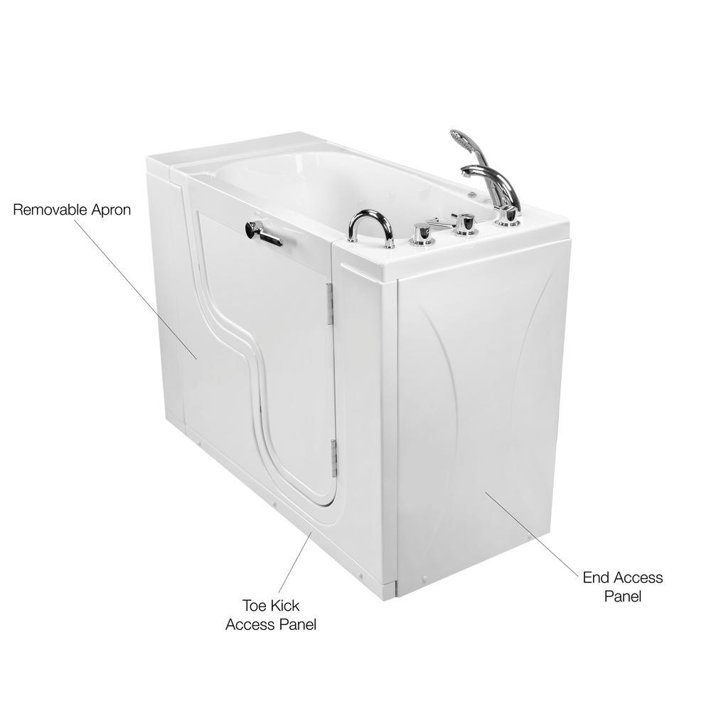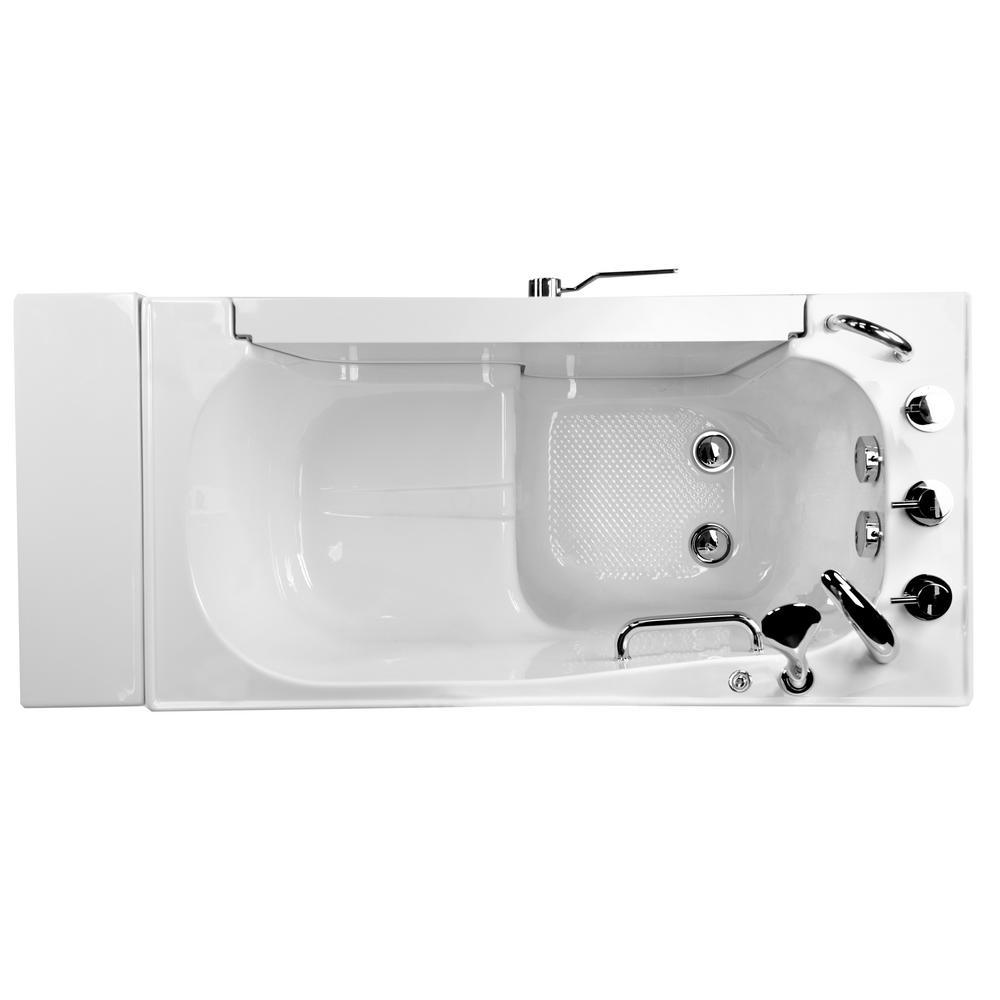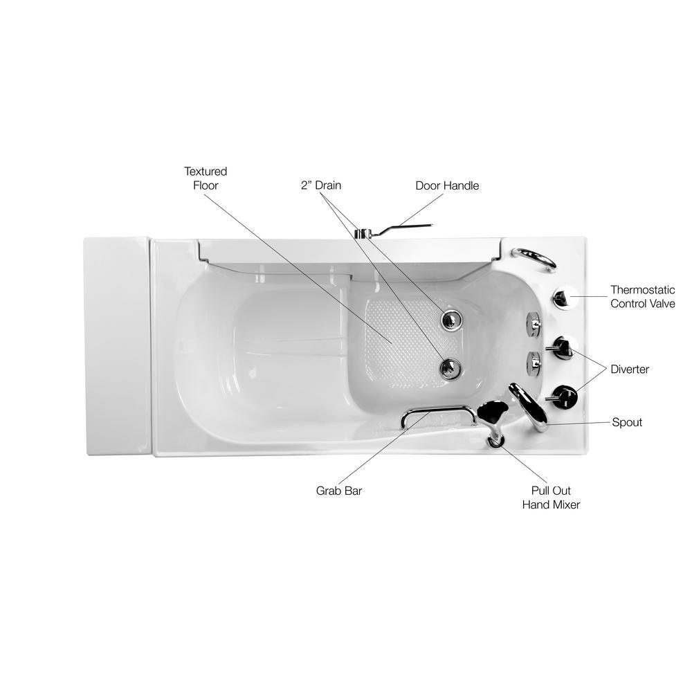 The Ella Transfer26 Wheelchair Accessible Bathtub is designed for bathers who use a wheelchair or for those who simply need an easy-to-enter tub and a smaller width to fit in smaller bathrooms. Bathers using a wheelchair can enter with ease from the side of the bathtub. The large entry through the wide, L-shaped outward swing door allows the bather to hold on to the deck- and wall-mounted pre-installed grab bars as they slide in or out of the walk-in tub bathtub. The Transfer walk-in bathtub is made with a textured, slip-resistant floor, 1 U-shaped, deck-mounted grab bar, and 1 interior sidewall-mounted grab bar. A soothing experience awaits inside. The 19.50 wide molded seat lets you bathe in a comfortable upright position. Youll have easy access to your choice of faucet, optional premium feature controls, and the pull-out hand shower for a convenient bathing experience. Optional Tubs available are Dual Massage, Hydro, Air, MicroBubble, Heated Seats and Backrest.