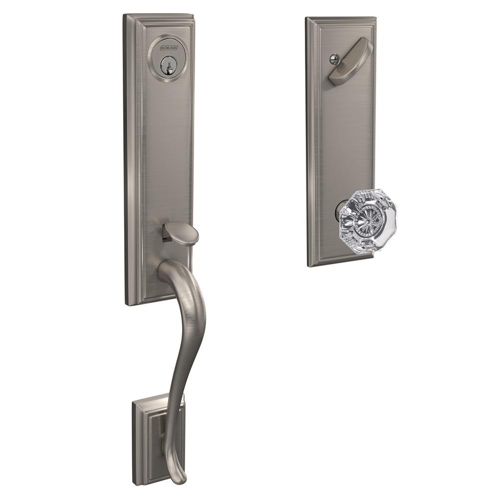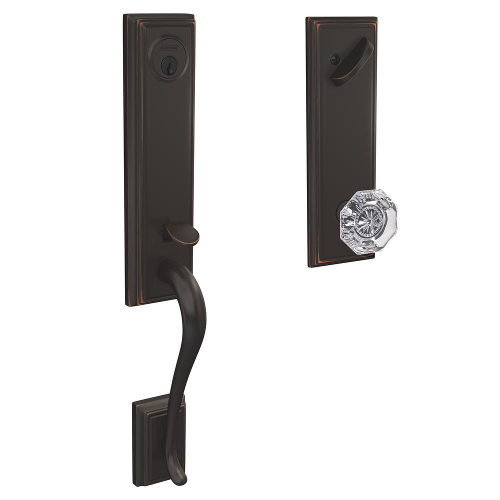 The ultimate in entryway style, the Schlage Custom Addison 3/4 in. Trim Single Cylinder Handle set with Alexandria Glass Knob (Aged Bronze) makes your front door unforgettable. Extended 3/4 in. trim from grip to deadbolt creates a high-style designer look. Inspired by the Victorian era, the Alexandria glass knob is multi-faceted with classic detailing sparkling in the center, while the Addison trims distinguished look incorporates subtle details without losing its classic simplicity. The Aged Bronze finish is inspired by traditional design, featuring warm, copper tones that break through its darker, aged exterior. Coordinate the style and finish of your homes door hardware inside and out by pairing with Schlage Custom interior door hardware.