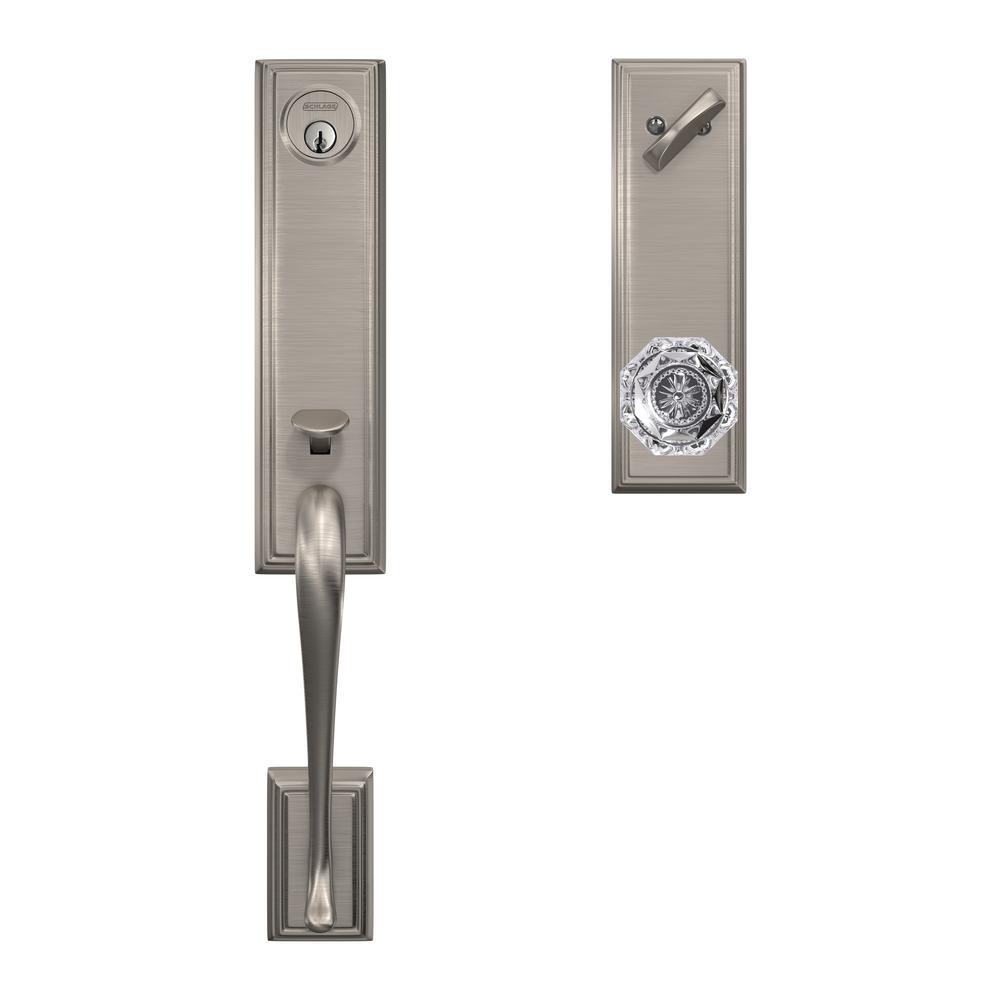 The ultimate in entryway style, the Schlage Custom Camelot 3/4 in. Trim Single Cylinder Handle set with Hobson Glass Knob (Satin Nickel) makes your front door unforgettable. Extended 3/4 in. trim from grip to deadbolt creates a high-style designer look. The Hobson glass knob is the perfect high-end statement piece for styles ranging from traditional to eclectic transitional, while the Camelot trims scalloped architectural details make any room charming and approachable especially when wrapped in our versatile Satin Nickel finish. Coordinate the style and finish of your homes door hardware inside and out by pairing with Schlage Custom interior door hardware.