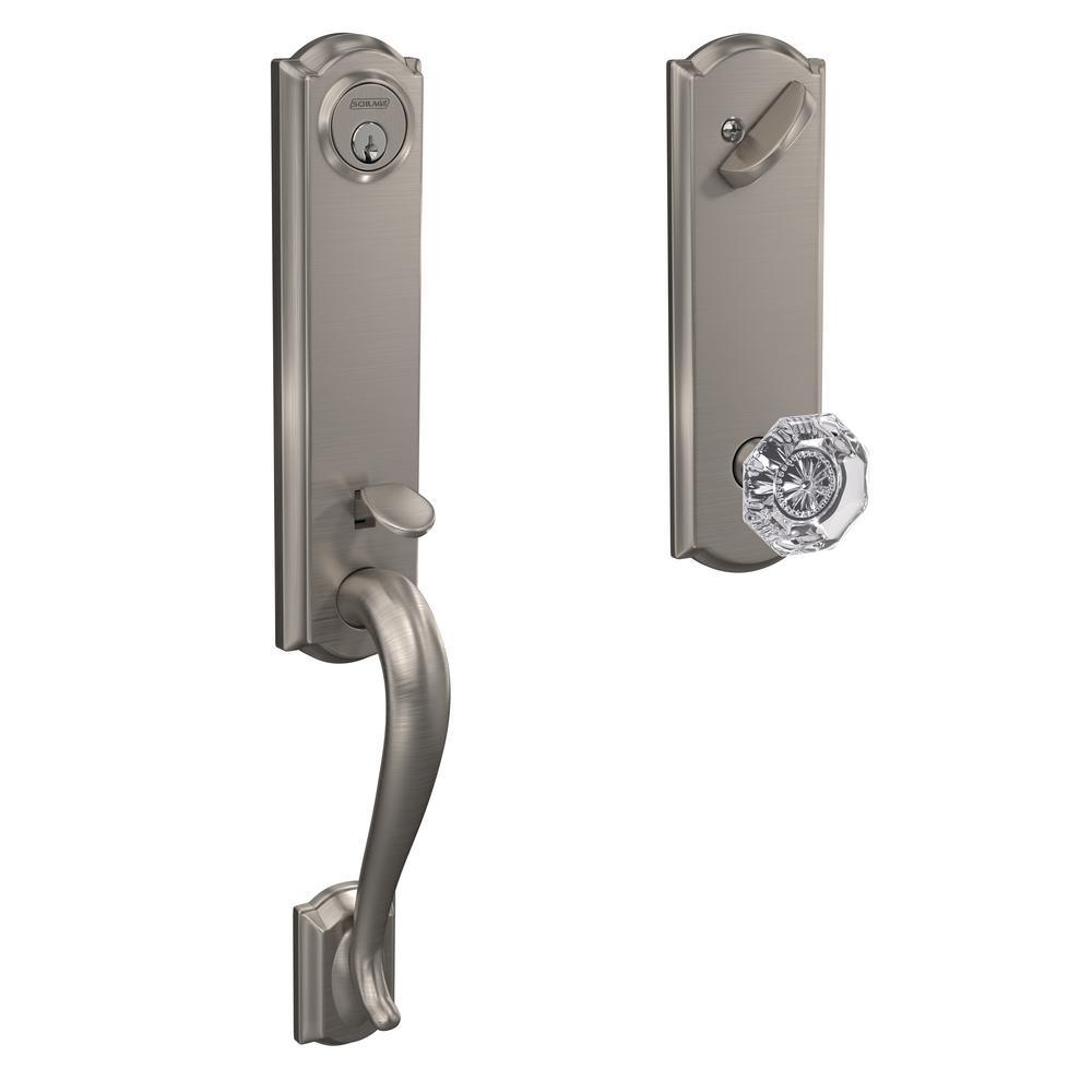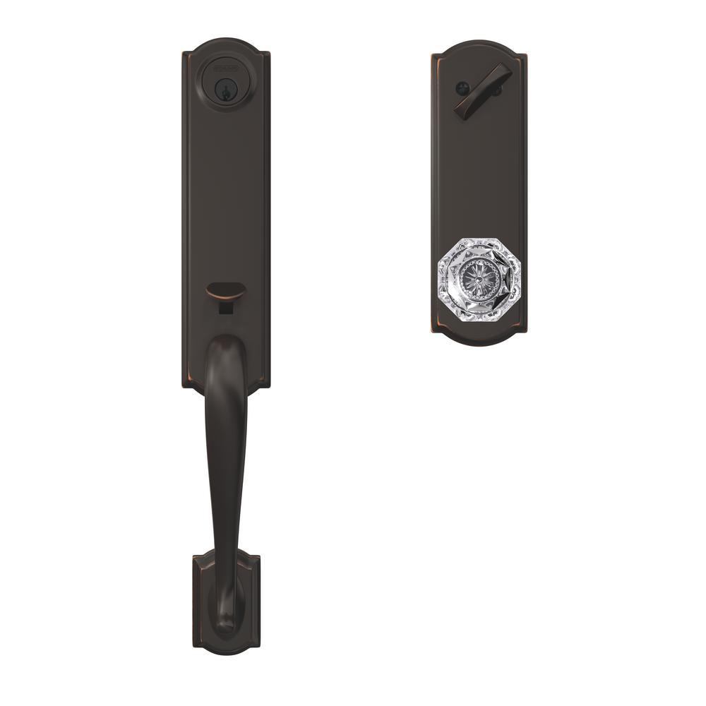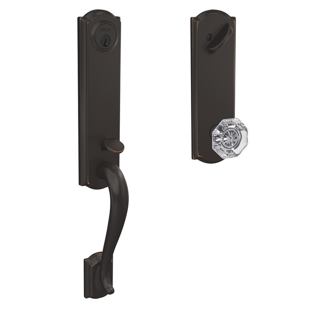 The ultimate in entryway style, the Schlage Custom Camelot 3/4 in. Trim Single Cylinder Handle set with Alexandria Glass Knob (Aged Bronze) makes your front door unforgettable. Extended 3/4 in. trim from grip to deadbolt creates a high-style designer look. Inspired by the Victorian era, the Alexandria glass knob is multi-faceted with classic detailing sparkling in the center, while the Camelot trims scalloped architectural details make any room charming and approachable. The Aged Bronze finish is inspired by traditional design, featuring warm, copper tones that break through its darker, aged exterior. Coordinate the style and finish of your homes door hardware inside and out by pairing with Schlage Custom interior door hardware.