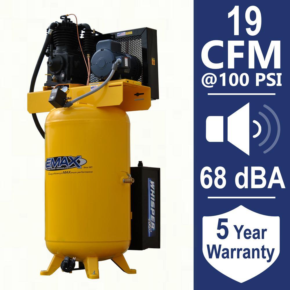 EMAX Compressor Tools and Equipment deliver overwhelming performance to ensure that they meet the needs of even the most demanding environments. All products are designed with exacting tolerance and specifications to deliver all the power that is needed at the Jobsite, Garage or Shop for extreme performance. All EMAX piston pumps deliver big air and include steel connecting rods and removable disc valves. Air Stream Technology insures you will have the coolest, quietest air compressor in the industry. It includes an air compressor silencer that is designed to suppress operating noise level and also acts as a filtration system to prevent foreign matter from entering the intake. The EMAX Silent Air Industrial Air Compressor offers super-quiet low RPM with solid cast iron construction for extended life. The EMAX Compressor with built on Whisper 100 is an affordable solution to your piston compressor noise problem. The Whisper 100 dissipates compressor intake noise by channeling the intake air through a series of baffle plates and pre-filter media within the silencer cabinet. As a result, the piston intake noise is trapped and dissipated within the silencer structure. The compressor intake filters are also located inside the Whisper 100-cabinet which further enhances noise reduction. The Whisper 100 noise suppression system is compact in design and is located on the back of the compressor tank. Plumbing intake air transfer hoses from the compressor head/heads to the silencer.