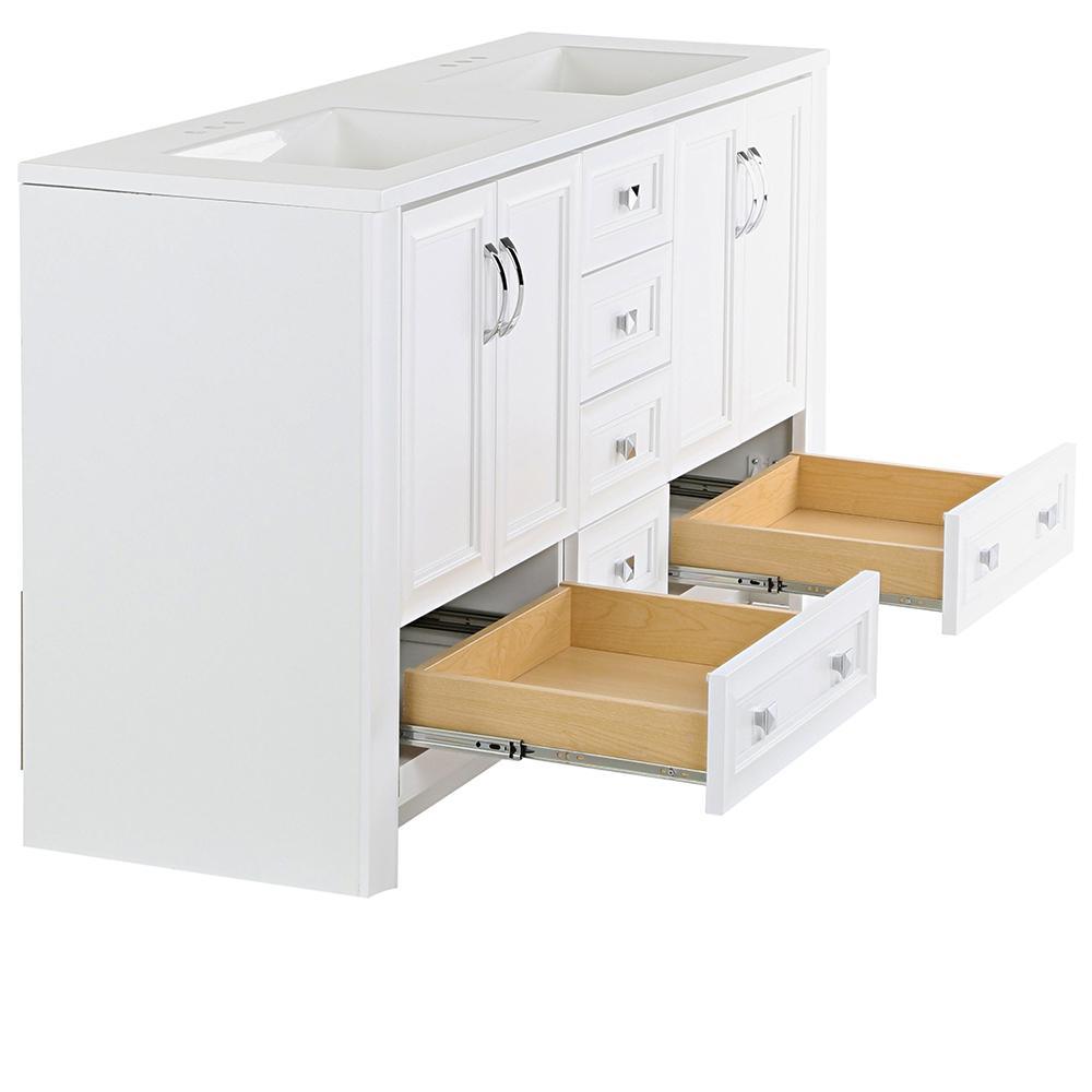 The 60.25 in. W Glacier Bay Candles by vanity in White with Cultured Marble vanity top in White is a captivating piece that displays a classic and contemporary feeling that will match any decor. The Candles by vanity cabinet features: a brilliant White finish and color matching furniture toe-kick, 4 centered and 2 lower end full extension drawers, and 4 decorative recessed paneled doors for maximum, and easy to access, storage. Complimented with a Solid White vanity top and accented with stylish, polished chrome cabinet hardware, the Candles by vanity is the ideal cabinet for the everyday home.