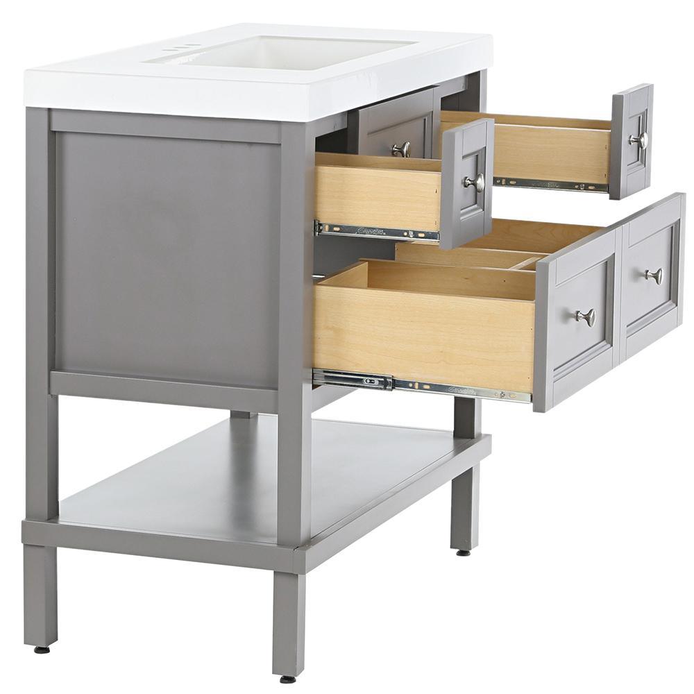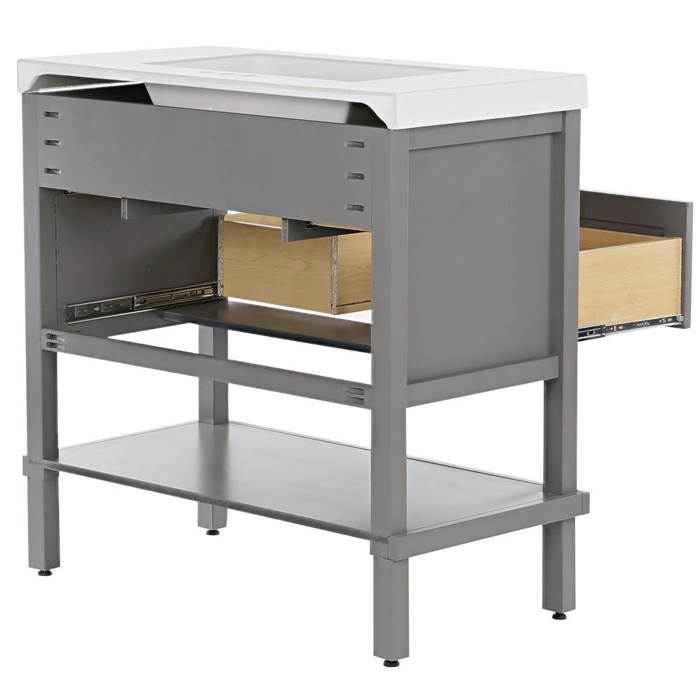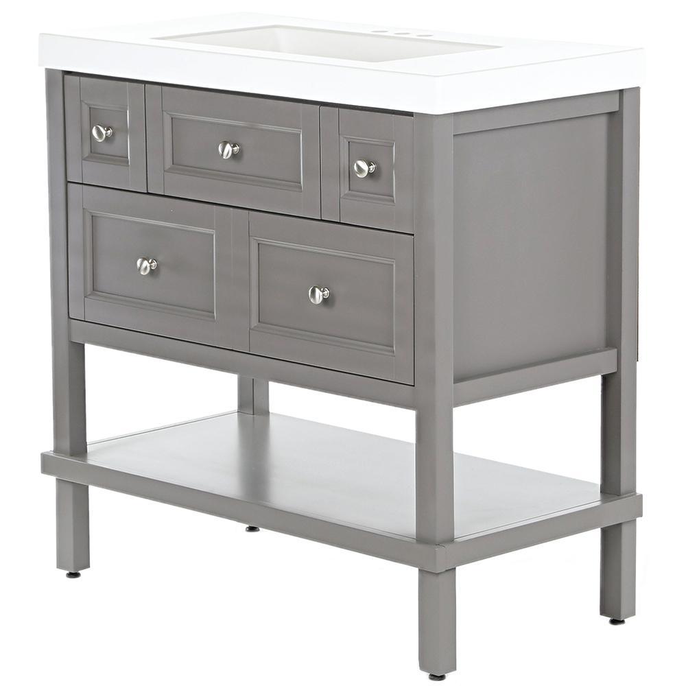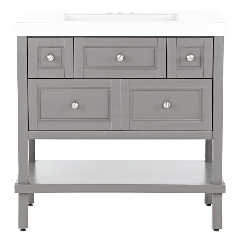 The Glacier Bay 36.7 in. W Ashland vanity in Taupe Gray is a charming unit with a furniture-style drawer design and 3 functional full extension drawers so that you may have complete access to your items and accessories. The Taupe Gray finished vanity cabinet is topped with a 2.25 in. T solid White vanity top and decorated with smooth brushed nickel pulls for a sleek and stylish appearance. With the vanity cabinet being fully assembled and ready to install, the Ashland vanity is a beautifully crafted piece that is guaranteed to create an air of elegance in any home.