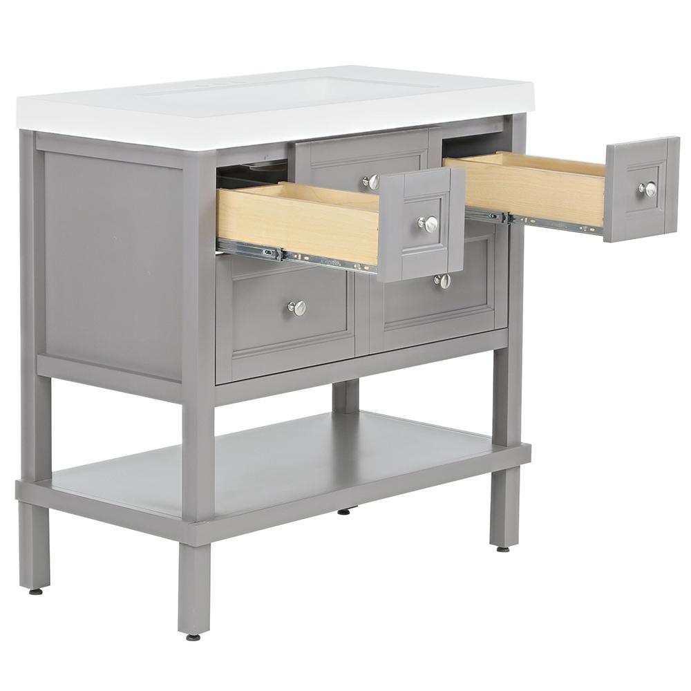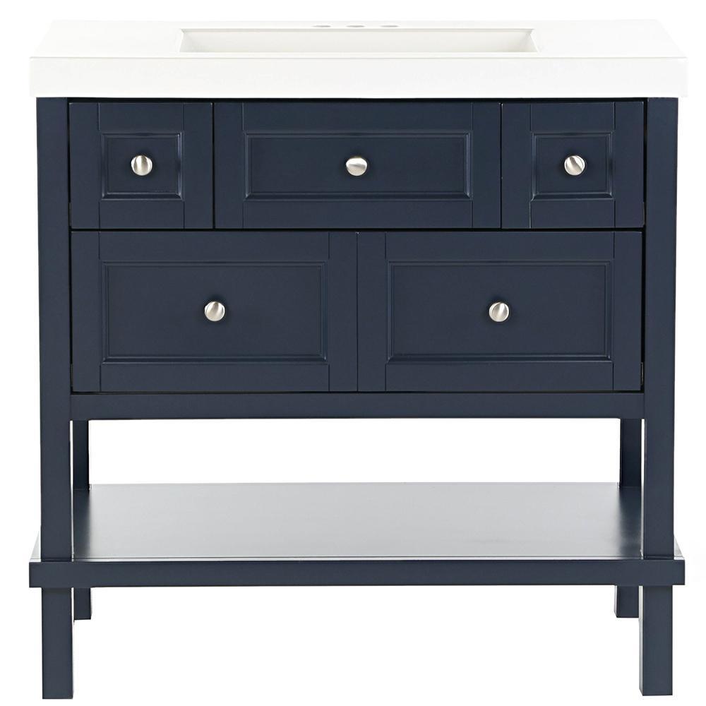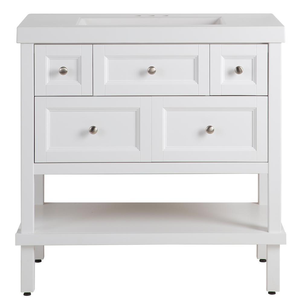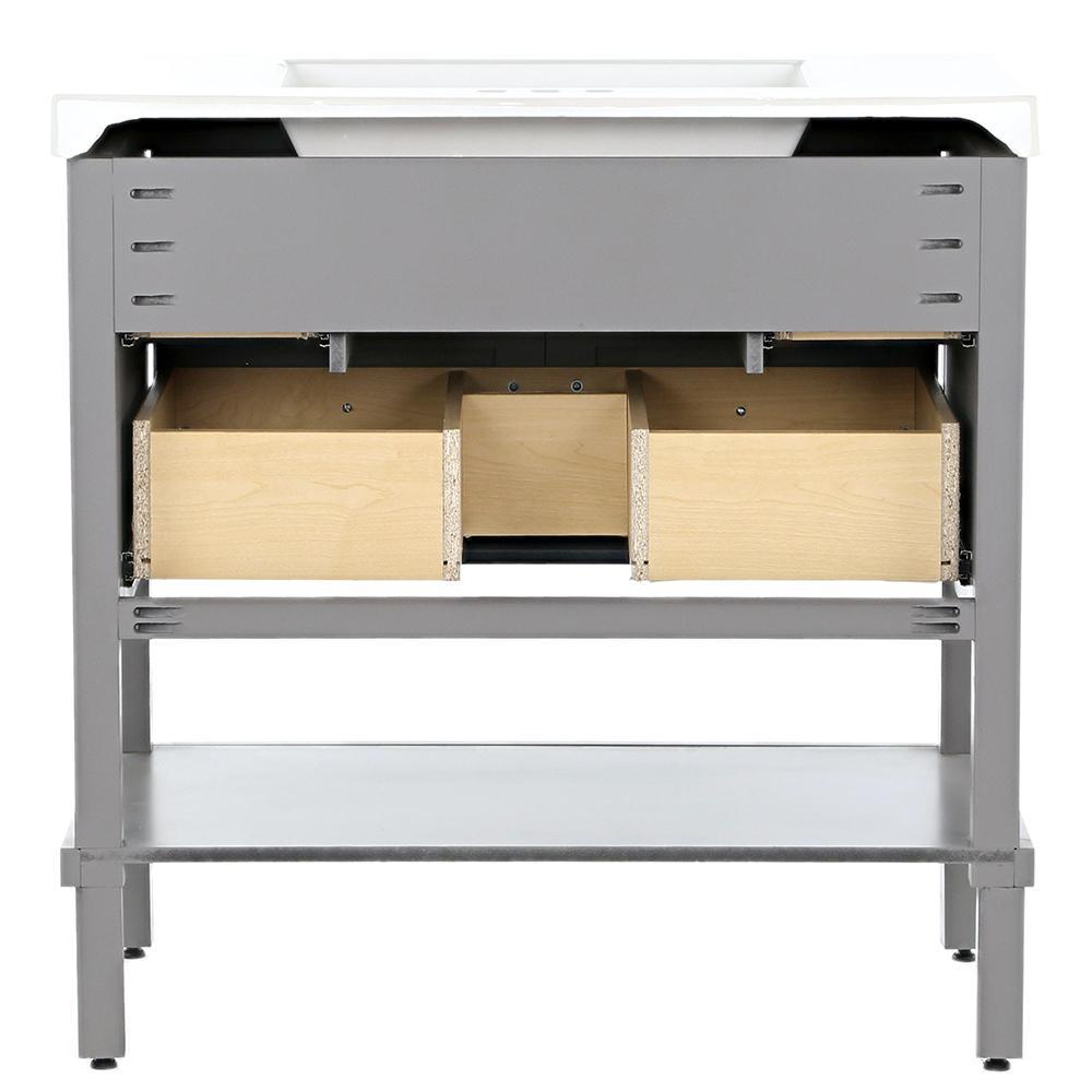 The Glacier Bay 36.7 in. W Ashland vanity in Taupe Gray is a charming unit with a furniture-style drawer design and 3 functional full extension drawers so that you may have complete access to your items and accessories. The Taupe Gray finished vanity cabinet is topped with a 2.25 in. T solid White vanity top and decorated with smooth brushed nickel pulls for a sleek and stylish appearance. With the vanity cabinet being fully assembled and ready to install, the Ashland vanity is a beautifully crafted piece that is guaranteed to create an air of elegance in any home.