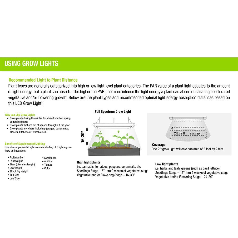 The Feit Electric 2 ft. LED Grow Light offers adjustable spectrum options, uses only 32-Watt, and comes fully assembled with an ultra-lightweight design. It can be hung or flush mounted, saving time, space, and money. The no-humming LED emits precise wavelengths for optimal photosynthetic response and has selectable switches for different growth stages. With a durable housing, easy installation, and the ability to link up to five fixtures together, these long-lasting lights provide energy-saving and efficient lighting for plants.