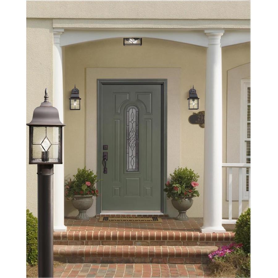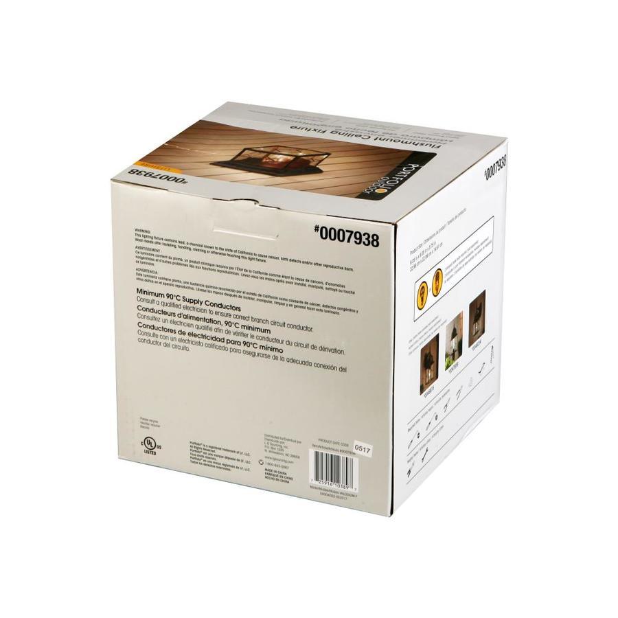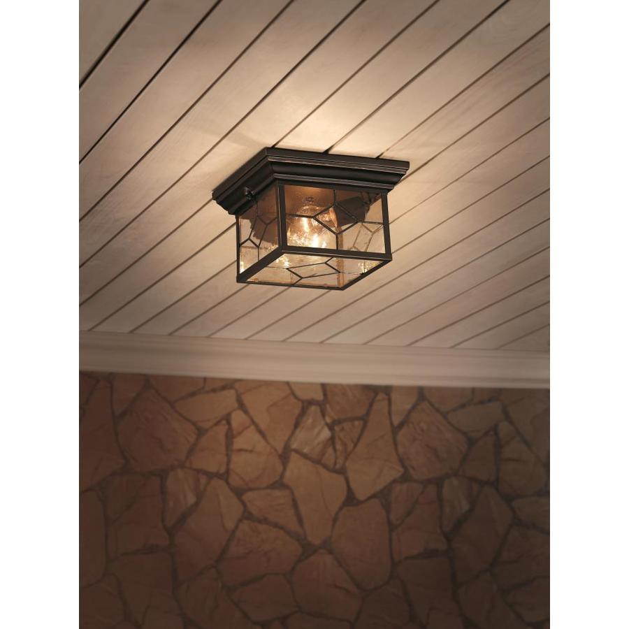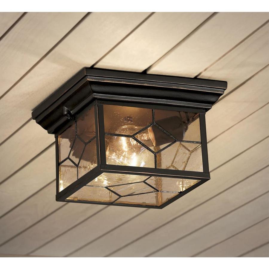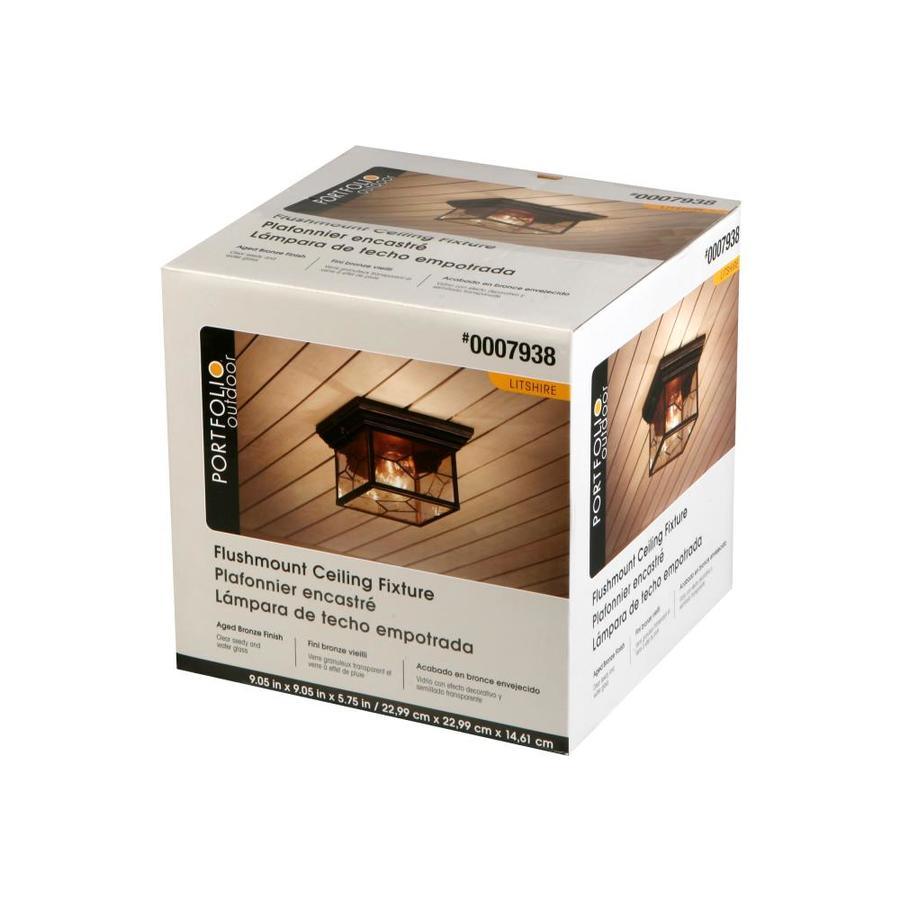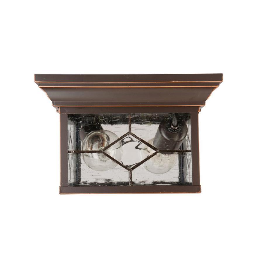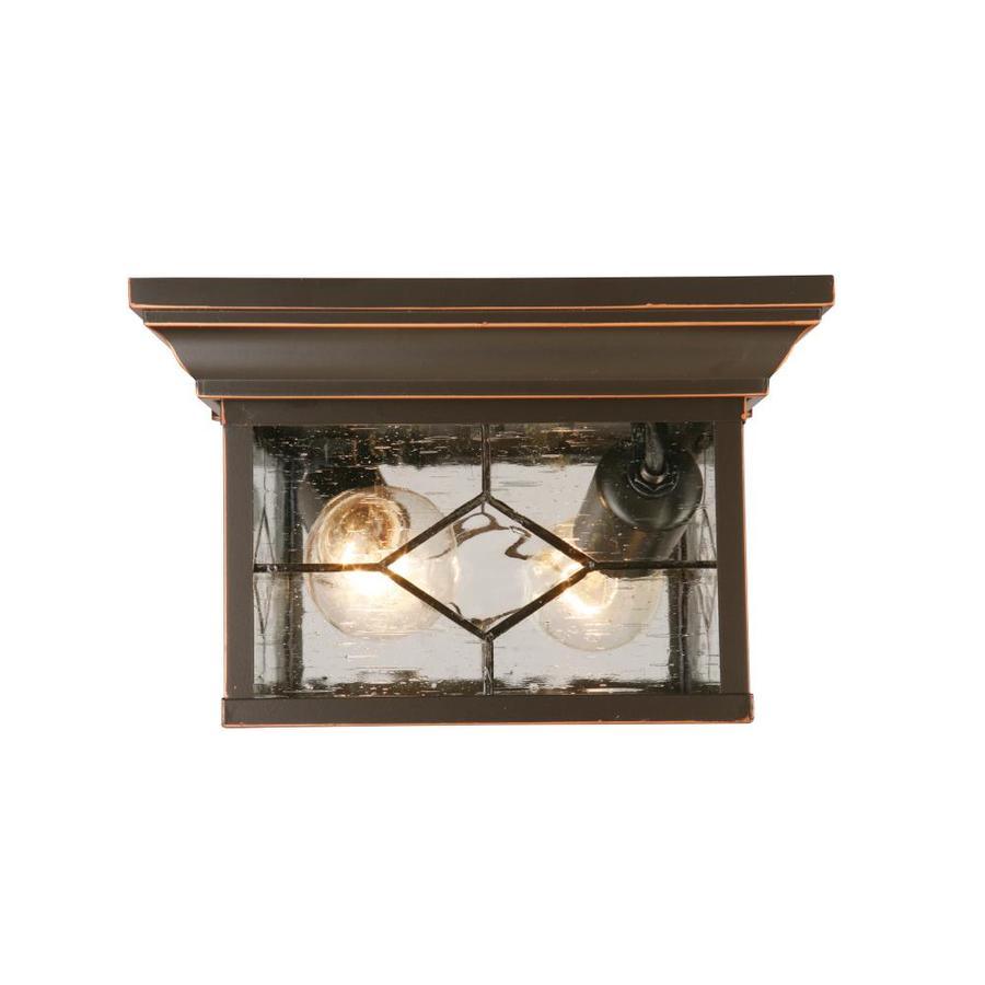 Oil-rubbed bronze finish ceiling flush mount light adds curb appeal to your home Clear seeded and clear water glass allows for brightly illuminating your entrance, patio area or for added security Uses two 60 watt medium base A19 bulbs(not included) Workable for dimming circuits when using appropriate light bulbs with dimmable function. so you can create your desired ambiance Mounting hardware and instruction manual enclosed for easy installation 9.05-in W x 5.875-in H x 9.05-in D UL safety listing demonstrates this product has met minimum requirements of widely accepted product safety standards Great for traditional style decor Damp rated, ideal for entranceway lighting