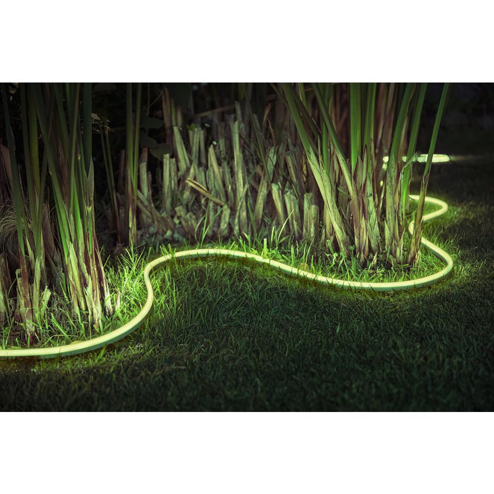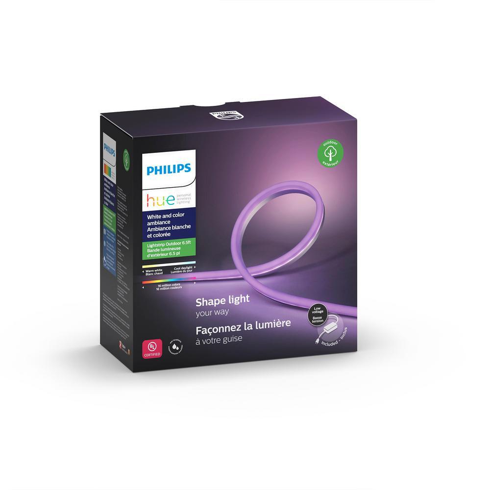 Illuminate your entryway upon returning home and set the mood for outdoor gatherings with the White and Color Ambiance Outdoor LED Dimmable Smart Wireless Light Strip (2M). Its diffuse coating allows for both direct and indirect lighting, and you can choose your preferred mounting orientation for the best effect. This versatile light strip offers easy control and creates the perfect ambiance for any occasion, whether it's highlighting your landscape or providing a relaxing atmosphere. With 16 million colors to choose from, you can find the perfect tone for every moment and setting. Plus, it seamlessly integrates with Amazon Alexa, Apple HomeKit, and Google Assistant for hassle-free operation. With a brightness of 850 lumens and a wide color temperature range of 2200-6500K, this light strip is ideal for discreet indoor accent lighting and can even be connected to wearable devices through IFTTT. Backed by a 2-year limited Philips warranty, this light strip is a must-have for any smart home setup.