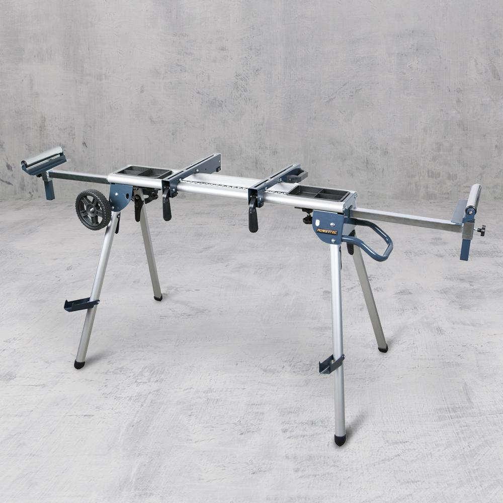 The Deluxe Rolling Miter Saw Stand with Trays by POWERTEC Handy Universal Design The POWERTEC MT4008 aluminum Miter saw stand with Trays offers the user easy, lightweight stand portability to and from the jobsite, while at the same time providing the rugged work-platform stability you need to get the job done, even in your most demanding applications. This Monster workstation handles a weight capacity of 330 lbs. This choice stand works with many brands of Miter saws. The extendable stock-feed rollers operate in both vertical and horizontal positions for maximum versatility. At project's completion, this premium stand folds up Flat and compact, thus insuring easy stand transfer and efficient storage. Two convenient tabletop snap-in tool trays are included for instant tool access. They are positioned on the metal screen (below the rails) so they will not interfere with the adjustment of your saw. Fold out material supports are mounted to the legs for convenient storage and easy access of materials up to 4-3/4" wide. In addition, with integrated material stops, uniform and repeated cuts can quickly and easily be executed. Set-up is a cinch. Just activate the handy locking-lever mechanism that efficiently locks the stand legs firmly in place. Firm-grip rubber-stop feet further enhance crucial stand integrity.
