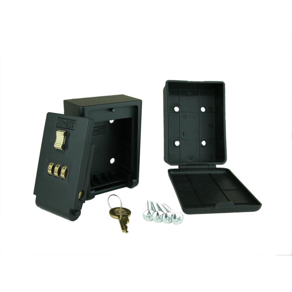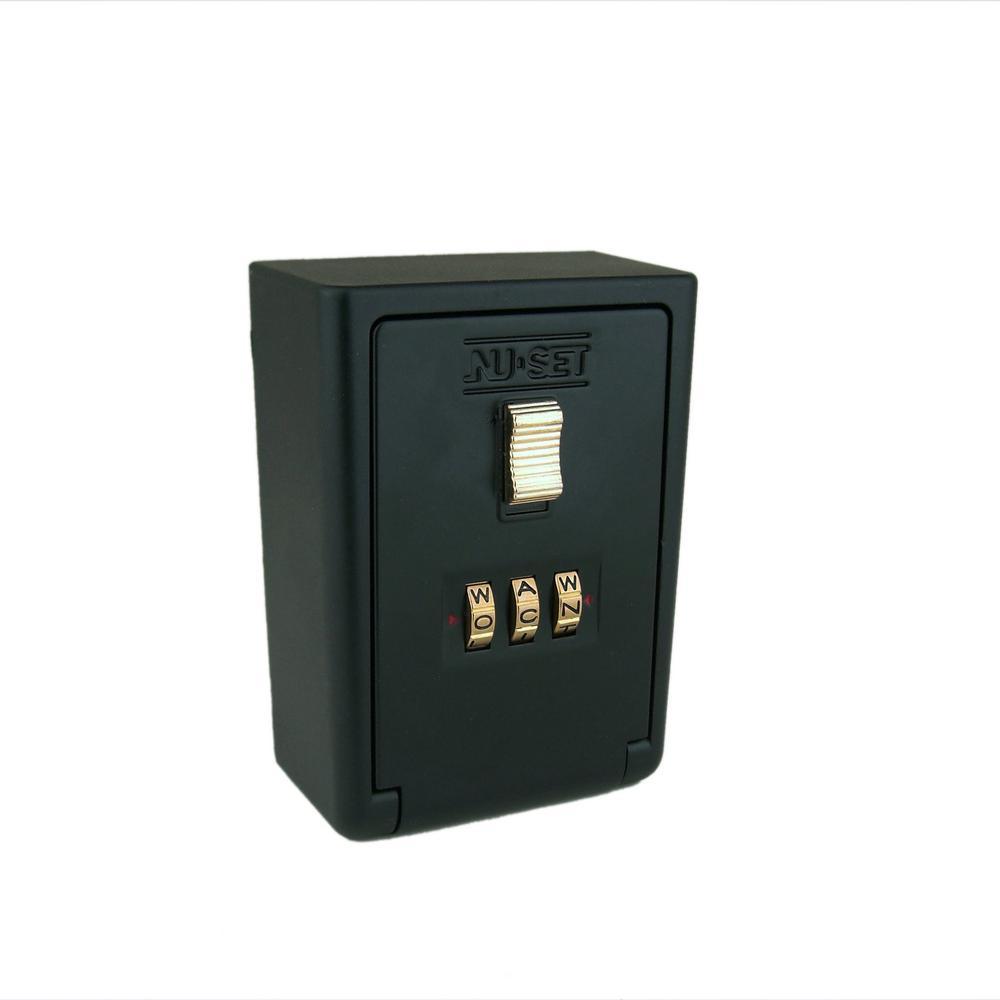 NUSET 2050 series 3 letter alpha combination wall mount lock box with protective cover. Large vault allows for extra key storage. Protective weather case completely encloses the box for added protection from elements.