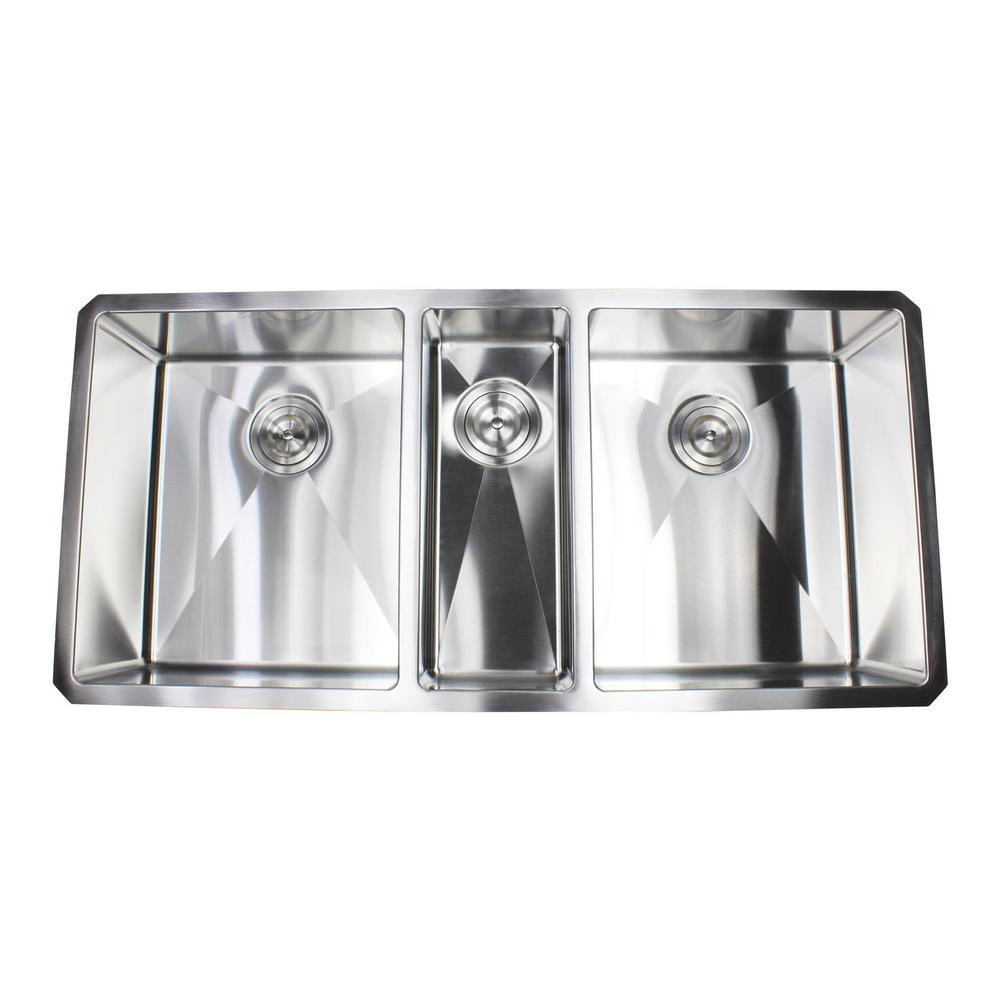 Are you and your family looking for a sturdy kitchen sink that functions perfectly for any type of occasion. Do you have trouble finding a kitchen sink package that includes complementary accessories to ease your kitchen duties. Look no further as we introduce the Premium 16-Gauge Stainless Steel Undermount Triple Bowl Kitchen Sink Combo. The Undermount Kitchen Sink is coated with a brushed stainless steel to provide a contemporary design. This amazing combo package includes a set of three silicone colanders and three deluxe strainers with lift-out basket. With 15 mm Radius Corners around the sink, it creates a larger bowl area and cleaning of the sink becomes effortless. Our sinks noise reduction sound pads block out loud noises and vibration when using of the kitchen sink. The Undermount Sink is certified under cUPC and covered by the Limited Lifetime Manufacturer Warranty (USA only). It has a 3.5 in. drain opening that is compatible with standard garbage disposals. Mounting hardware, installation brackets, and cutout template are included. This Undermount Triple Bowl Kitchen Sink Combo is a must-buy for anyone looking to upgrade their kitchen decor with matching accessories to assist on kitchen tasks. The dimensions are as follow: Exterior Size: 42 in. x 20 in. x 10 in. / Left Bowl: 15.5 in. x 18 in. x 10 in. Deep / Middle Bowl: 7 in. x 18 in. x 7 in. Deep / Right Bowl: 15.5 in. x 18 in. x 10 in. Deep.