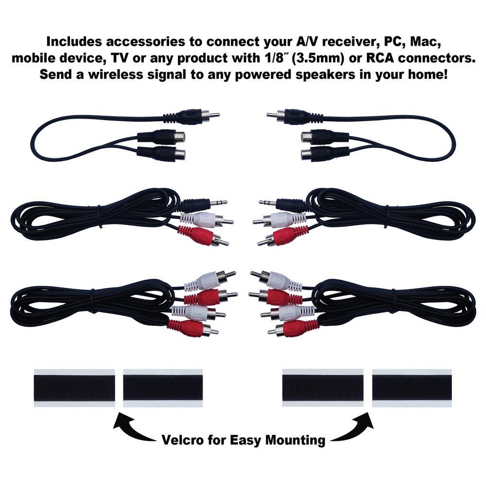 - Includes self-adhesive VELCRO strips, transmitter, receiver, 2 external antennas, 2 USB AC power adapters, 2 USB cords, 2 RCA to RCA stereo patch cables, 2 RCA Y-adapter cables and two 3.5 mm, stereo to RCA cables