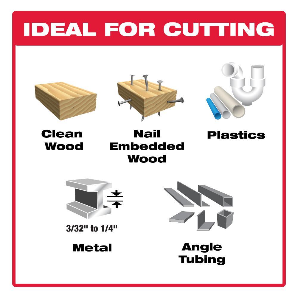 - Ideal for cutting nail-embedded wood, ferrous metal applications with a 3/32 in. x 1/4 in. T and PVC/pipe materials