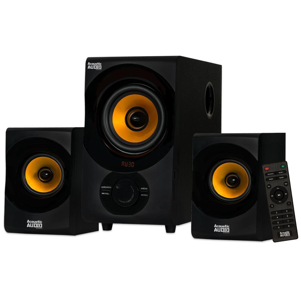 This Acoustic Audio by Goldwood 2.1 Bluetooth Speaker System features a contemporary design and is a stylish addition to any home. This 350-Watt, 3-piece system includes 1 powered subwoofer and 2 satellite speakers as well as the necessary cable and instructions needed to Plug and Play any audio source. Use it for your home theater stereo system, personal computer or laptop, DVD player, TV, gaming system, MP3 player, or other devices with a 3.5 mm or RCA audio output (3.5 mm to RCA cable included). The powered subwoofer features a front-firing woofer and utilizes a digitally tuned wooden enclosure for increased bass response. You can control volume function directly from the subwoofer. The full-range satellite speakers feature magnetic shielding for use near televisions and computer monitors.