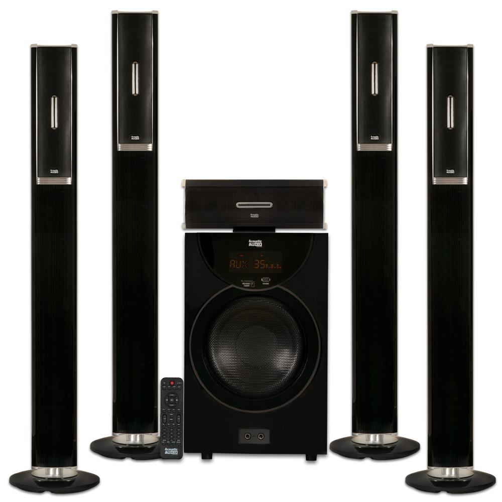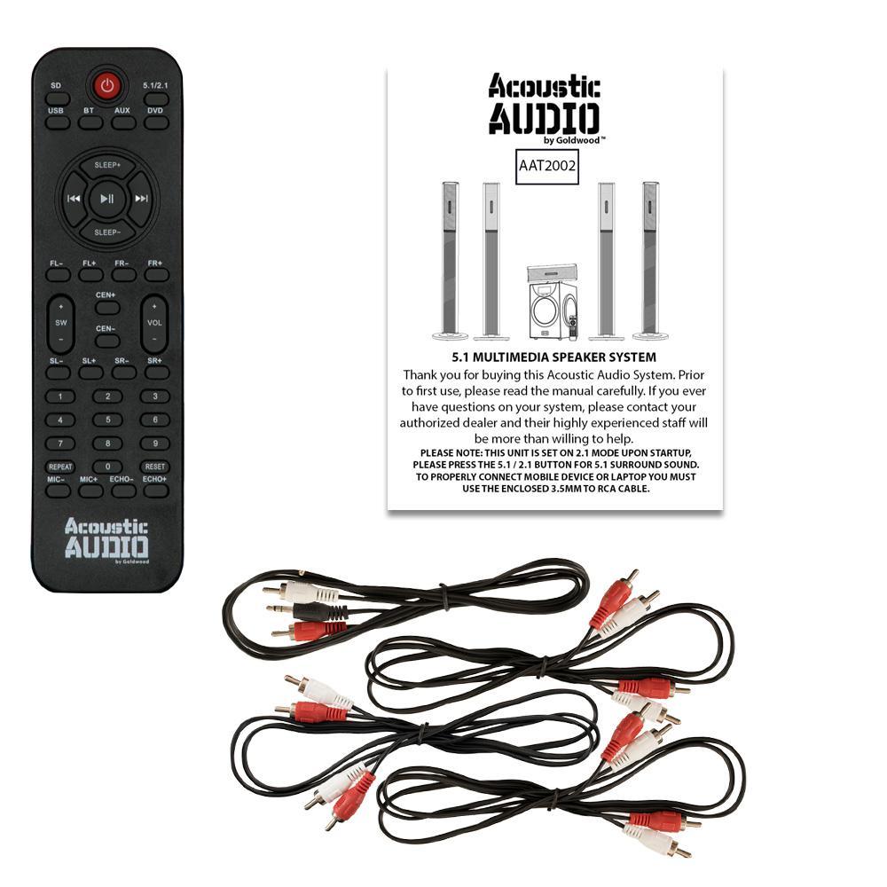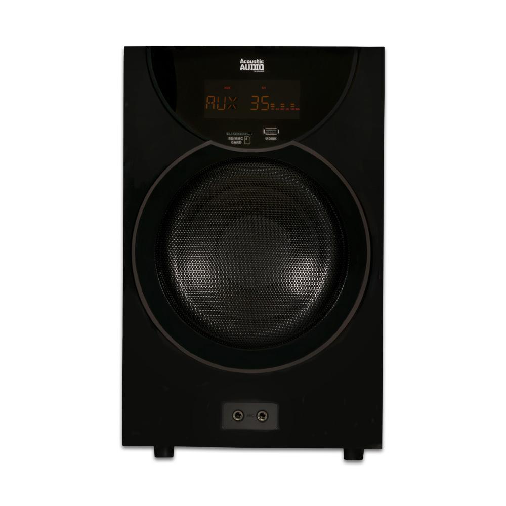 This Acoustic Audio 5.1 Bluetooth System features a contemporary design and is a stylish addition to any home. This 1000-Watt, 6-piece system includes 1 8 in. powered subwoofer, 4 tower satellite speakers and a bookshelf center speaker as well as cables and instructions needed to Plug and Play any audio source with a RCA audio output or use the front panel USB interface or SD/MMC card input. Built in Bluetooth receiver. Use it for your home theater system, personal computer or laptop, gaming system, cell ph1, MP3 player or any other audio devices with 3.5 mm headph1 output. The powered subwoofer features independent speaker controls as well as bass, treble and volume functions. It utilizes a digitally tuned wooden enclosure for increased bass response.