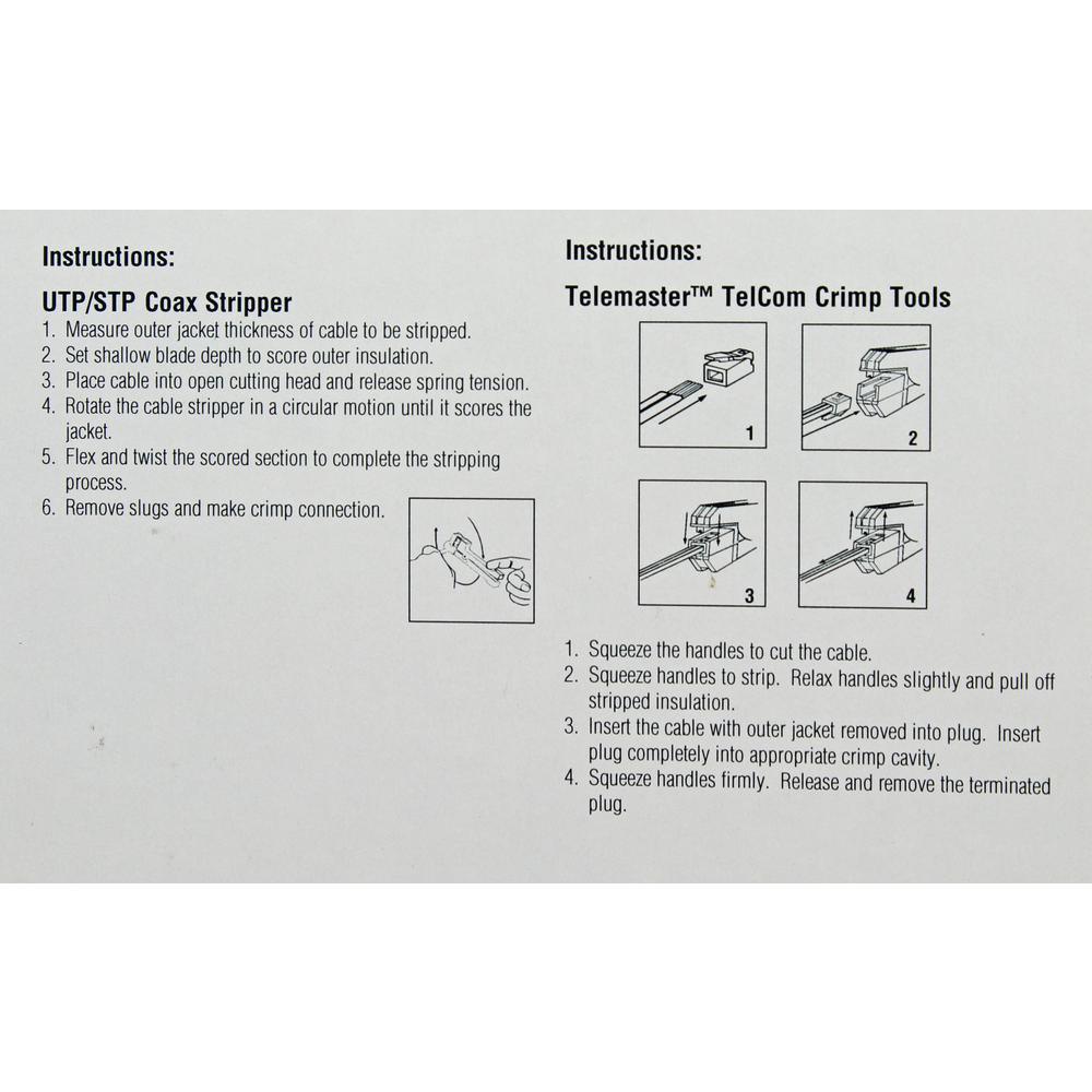 • 30-496 telemaster crimps industry standard CAT5e/6 RJ-45 (8P8C) and RJ-11/12 (6P6C/6P4C) modular plugs