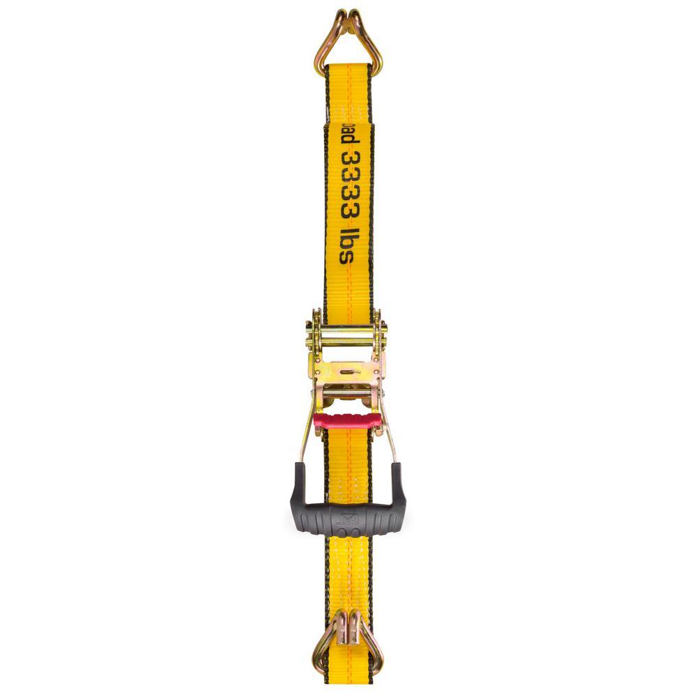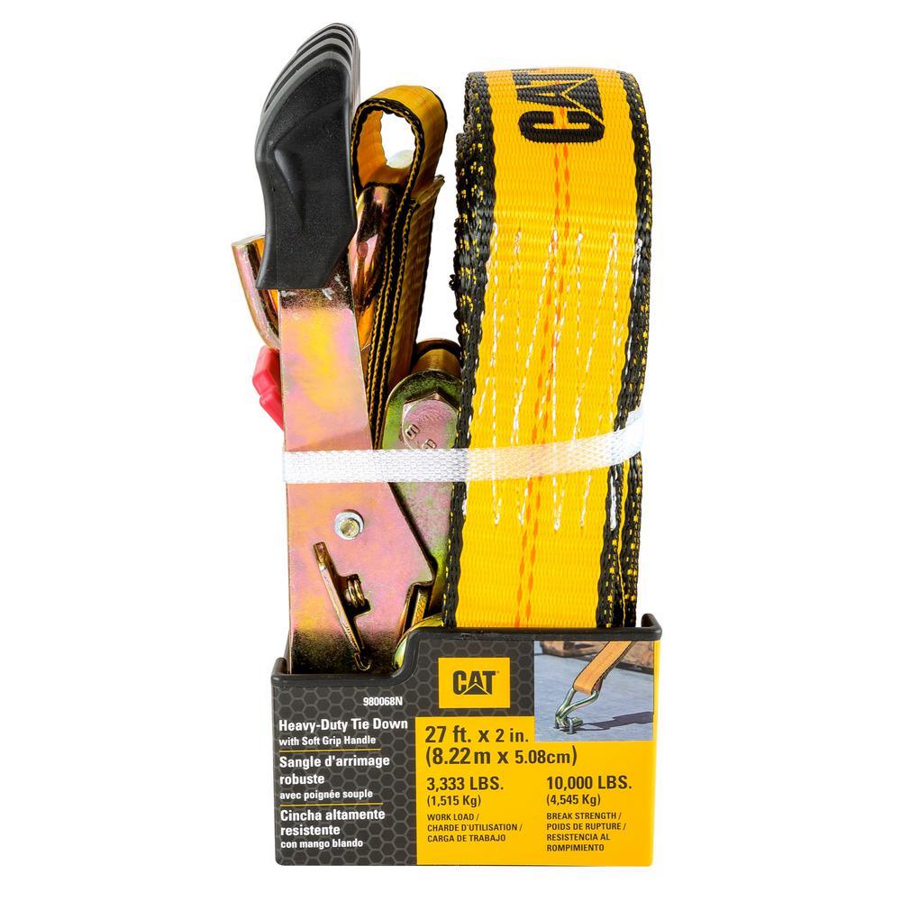 Designed and built to perform in the most demanding tasks and conditions, CAT tie-down straps are Built for It. Use this 2 ft. x 27 ft. ratcheting tie-down to secure crates, machinery, vehicles, farm implements and more. The high visibility yellow strap offers 3333 lbs. working capacity, with zinc coated hardware and double j-hooks and molded rubber ratchet handle.