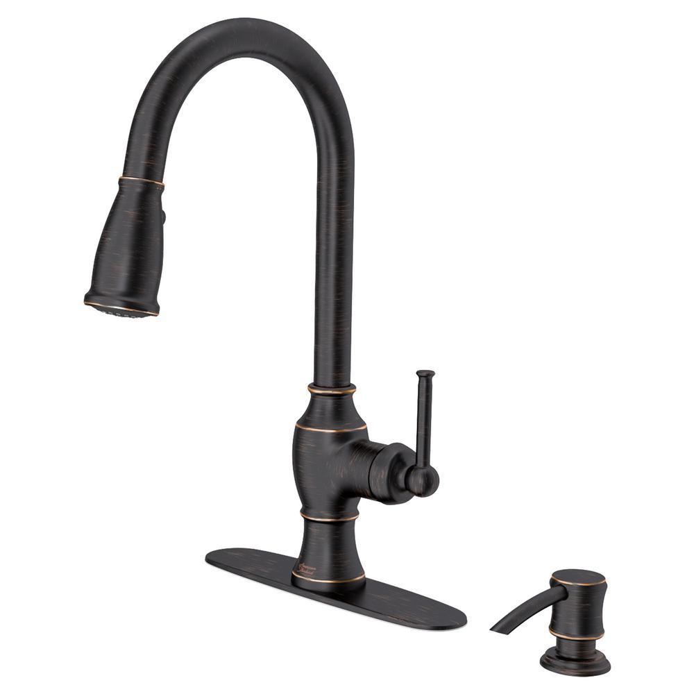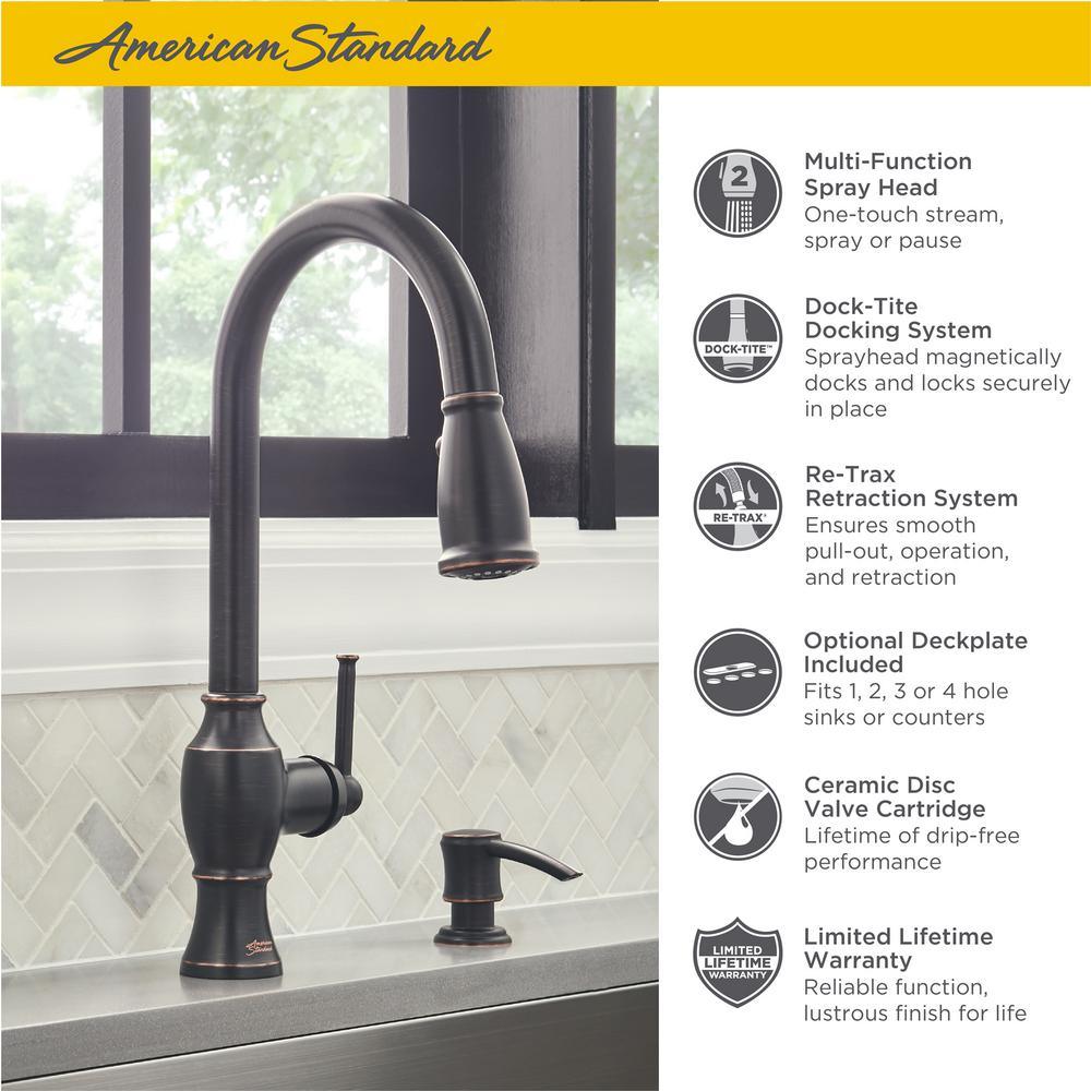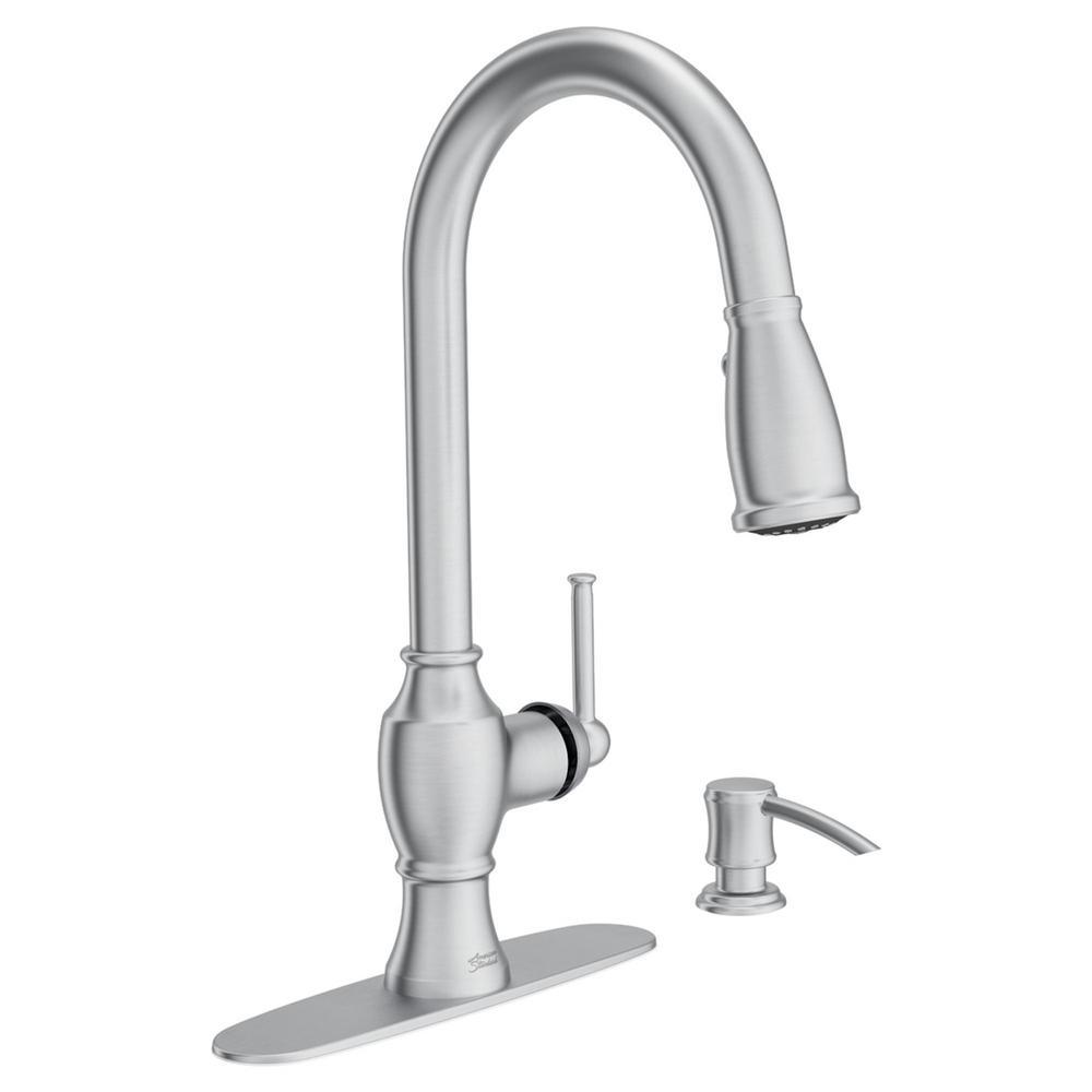 The Marchand Single-Handle Pull-Down Faucet from American Standard adds classic style and modern functionality to your kitchen. Recognized for durability and dependable performance, this high-arc swivel style is ideal for filling large pots and has a 3-function pull-down featuring stream, spray and pause for maximum efficiency. Magnetic Dock-Tite technology ensures the faucet stays securely in place. Comes with coordinating soap dispenser.