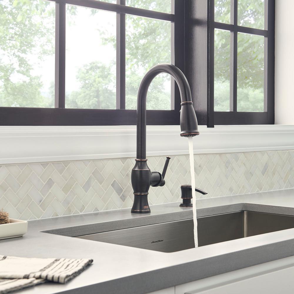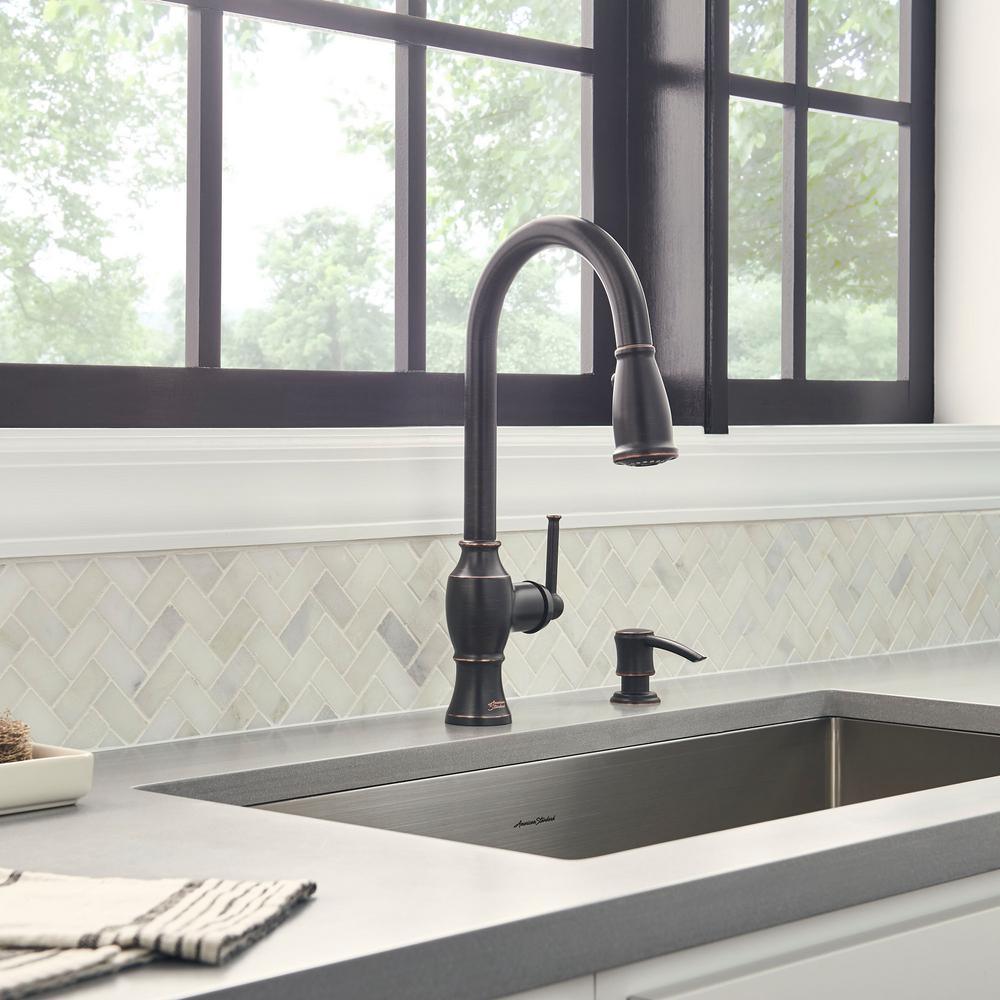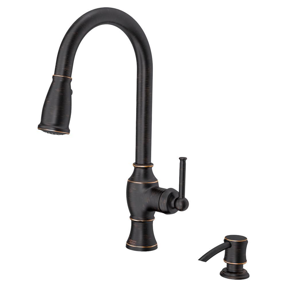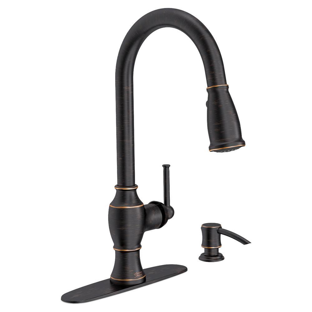 The Marchand Single-Handle Pull-Down Faucet from American Standard adds classic style and modern functionality to your kitchen. Recognized for durability and dependable performance, this high-arc swivel style is ideal for filling large pots and has a 3-function pull-down featuring stream, spray and pause for maximum efficiency. Magnetic Dock-Tite technology ensures the faucet stays securely in place. Comes with coordinating soap dispenser.