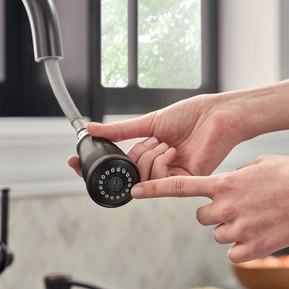 • Option for stream or spray with a single touch to make cleanup fast and easy, plus a pause function
