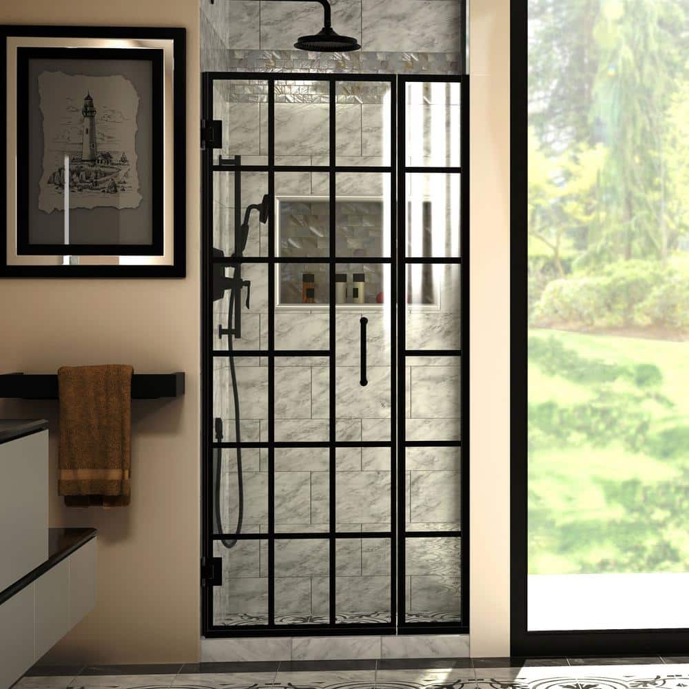 The DreamLine Unidoor Toulon is a modern frameless shower door with a bold and captivating satin black finish. Featuring a stylish window pane design and JetGlaze glass pattern, it's easy to maintain with its durable paint application and ClearMax water repellant coating. Constructed with 3/8 inch thick certified tempered glass, this shower door adds a touch of elegance to any bathroom space. With reversible options, solid brass hinges, and anodized aluminum U-channel attachments, the Unidoor Toulon offers both functionality and style. Don't forget to pair it with the matching single threshold SlimLine shower base (sold separately) for a complete and upscale look. Please note, professional installation is recommended and a limited 1-year manufacturer warranty applies.